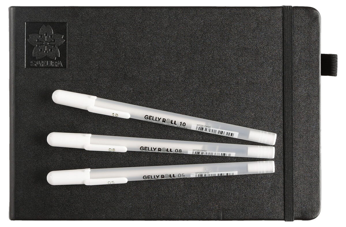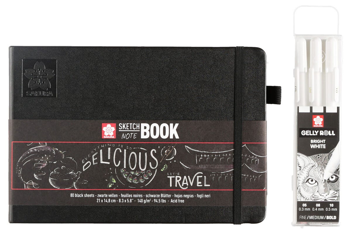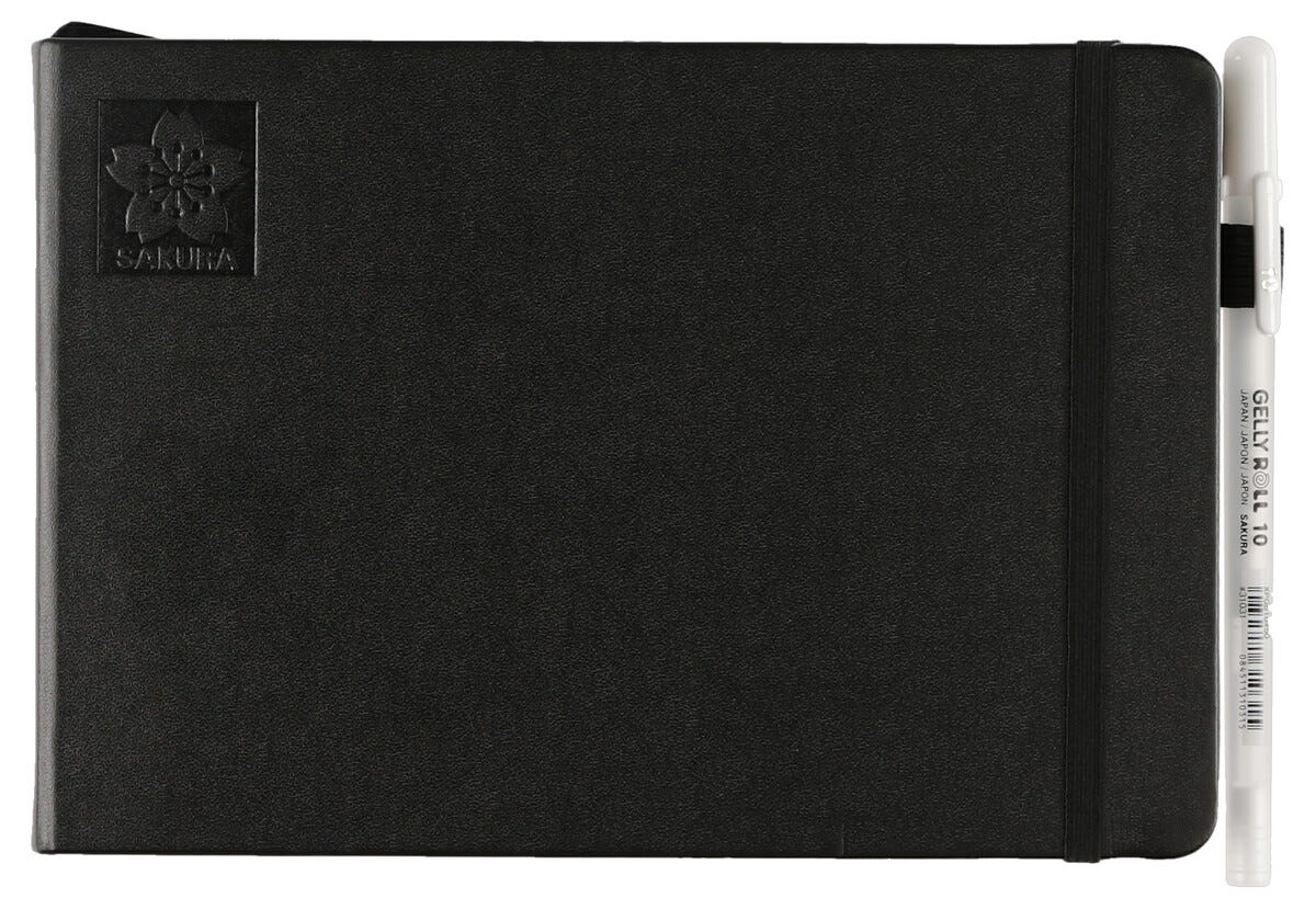 Luonnoskirja mustilla sivuilla ja 3 valkoista kynää, Sakura