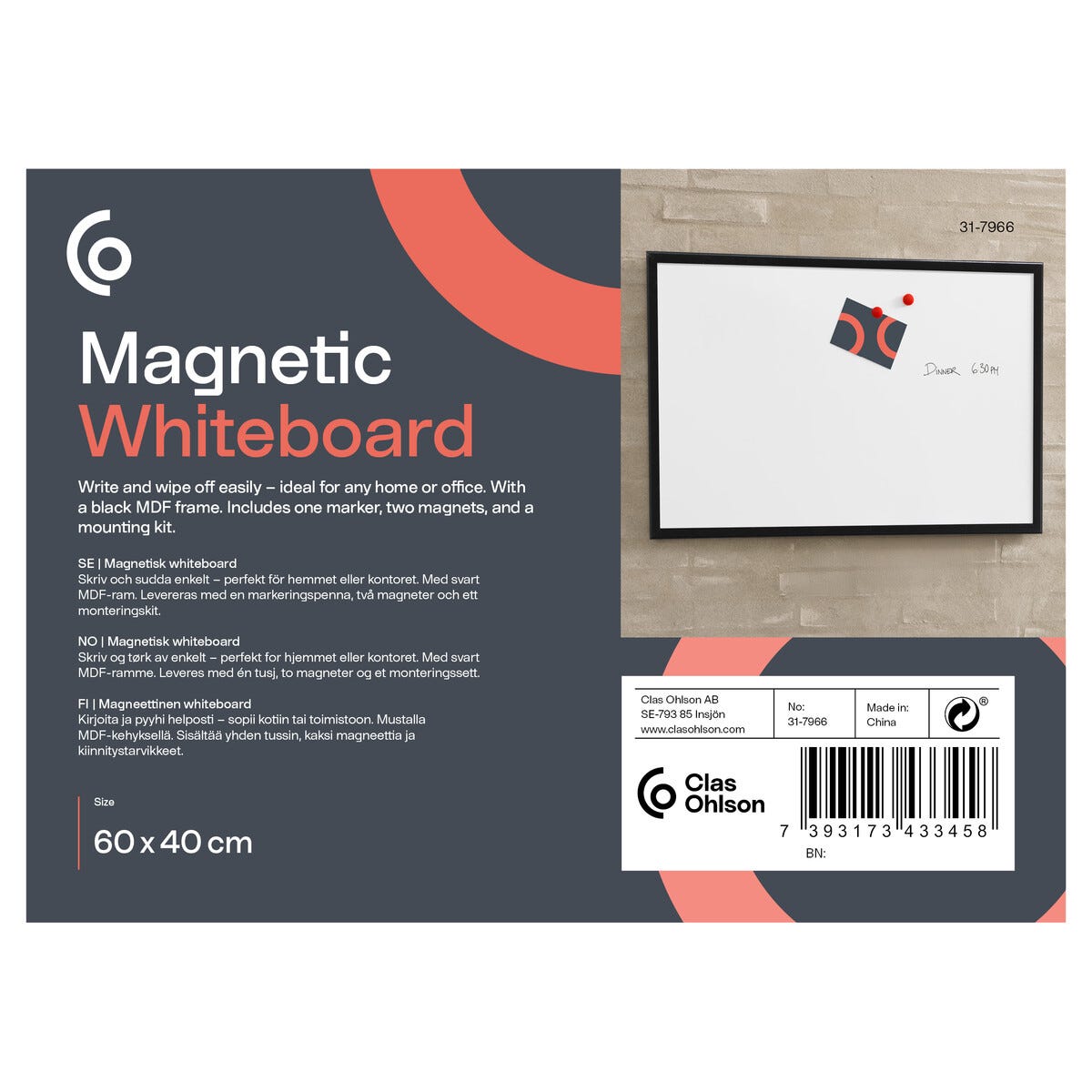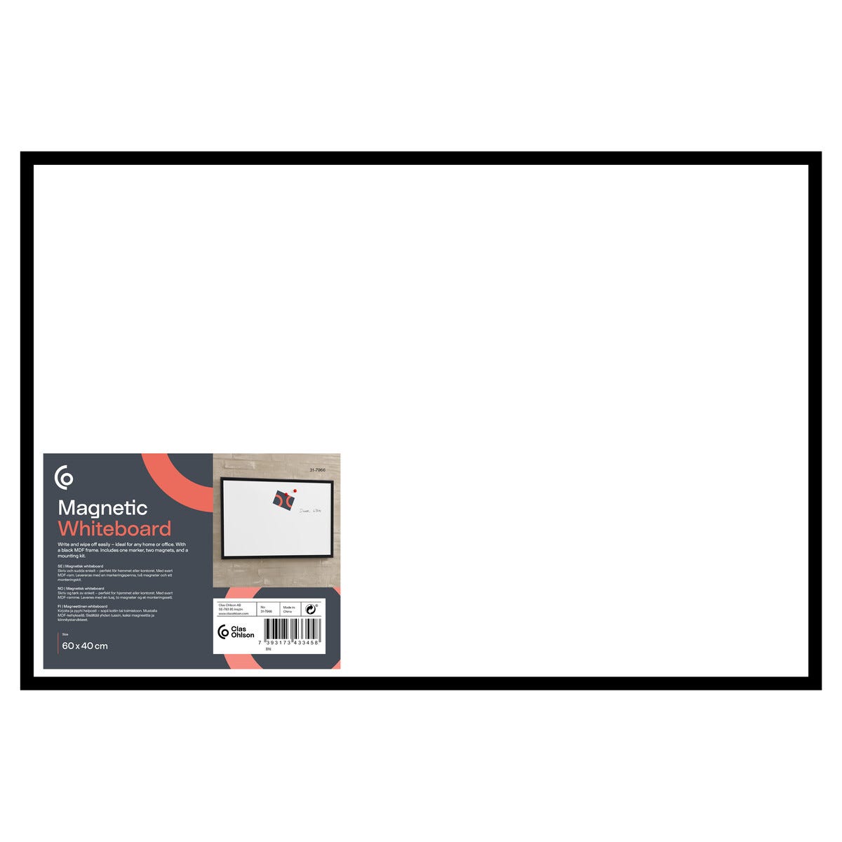 • Magneettinen valkotaulu mustalla MDF-kehyksellä – sisältää magneetit ja kynän.