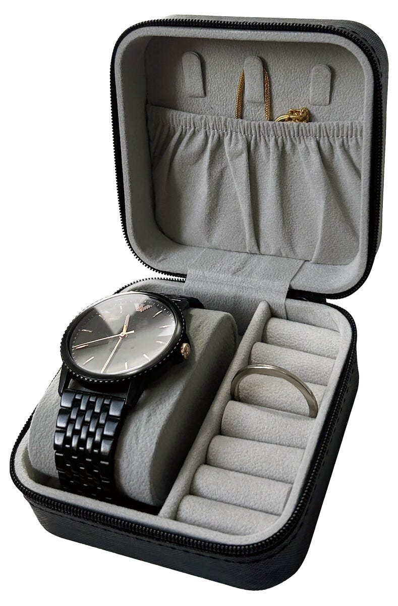 • Matkakorurasia, jossa on lokerot kelloille, rannekoruille, korvakoruille, kalvosinnapeille ja sormuksille.
