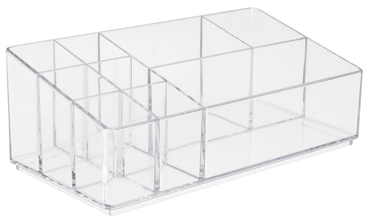 Meikkiteline, 9 lokeroa, läpinäkyvää muovia