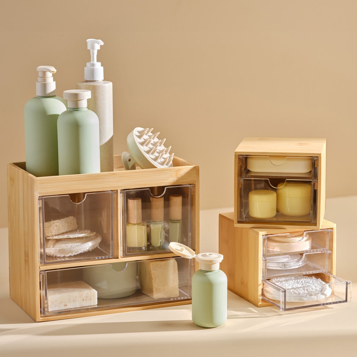 • Meikkiteline bambua – isoja ja pieniä vetolaatikoita.