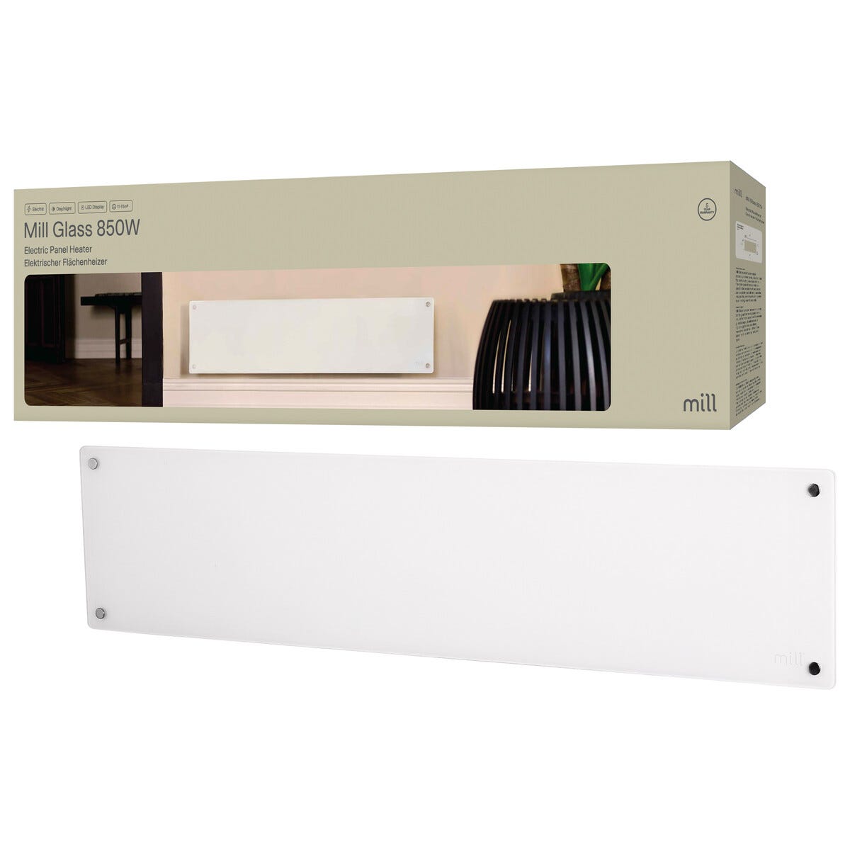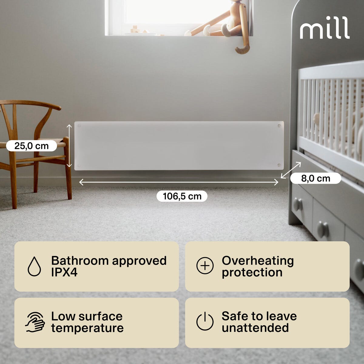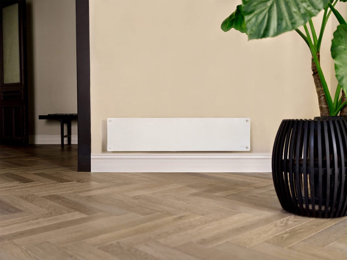 • Mill Glass -sähköpatteri seinään asennusta varten – sopii hyvin ikkunan alapuolelle.