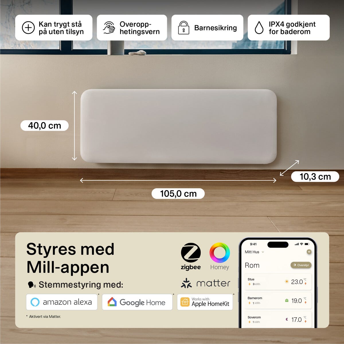 • Energiatehokas sähköpatteri seinälle tasaiseen lämmitykseen – sopii jopa 28 m²:n tiloihin.