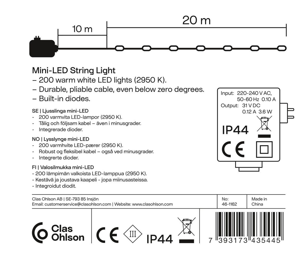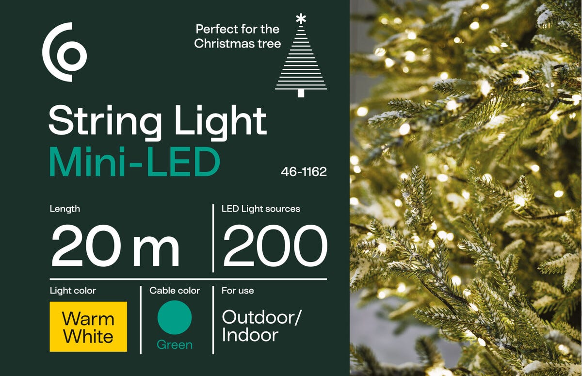 • Mini-LED-valoketju, lämmin valkoinen, 20 m – taipuisa ketju toimii myös pakkasella.