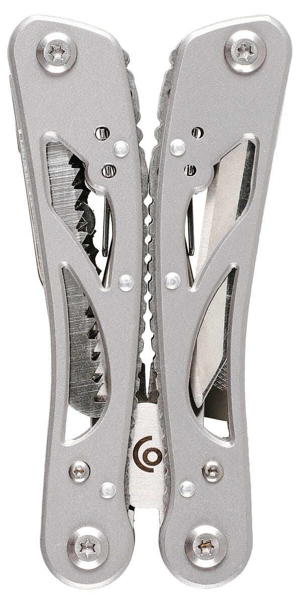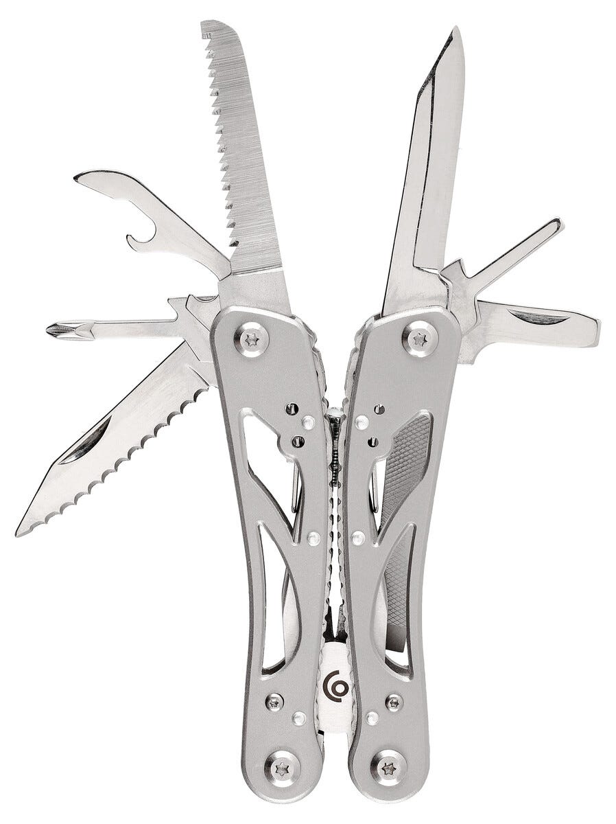 • Ruostumattomasta teräksestä valmistettu monitoimityökalu, jossa veitsi, ruuvimeisseli, sivuleikkuri jne.