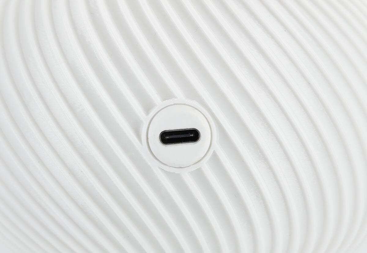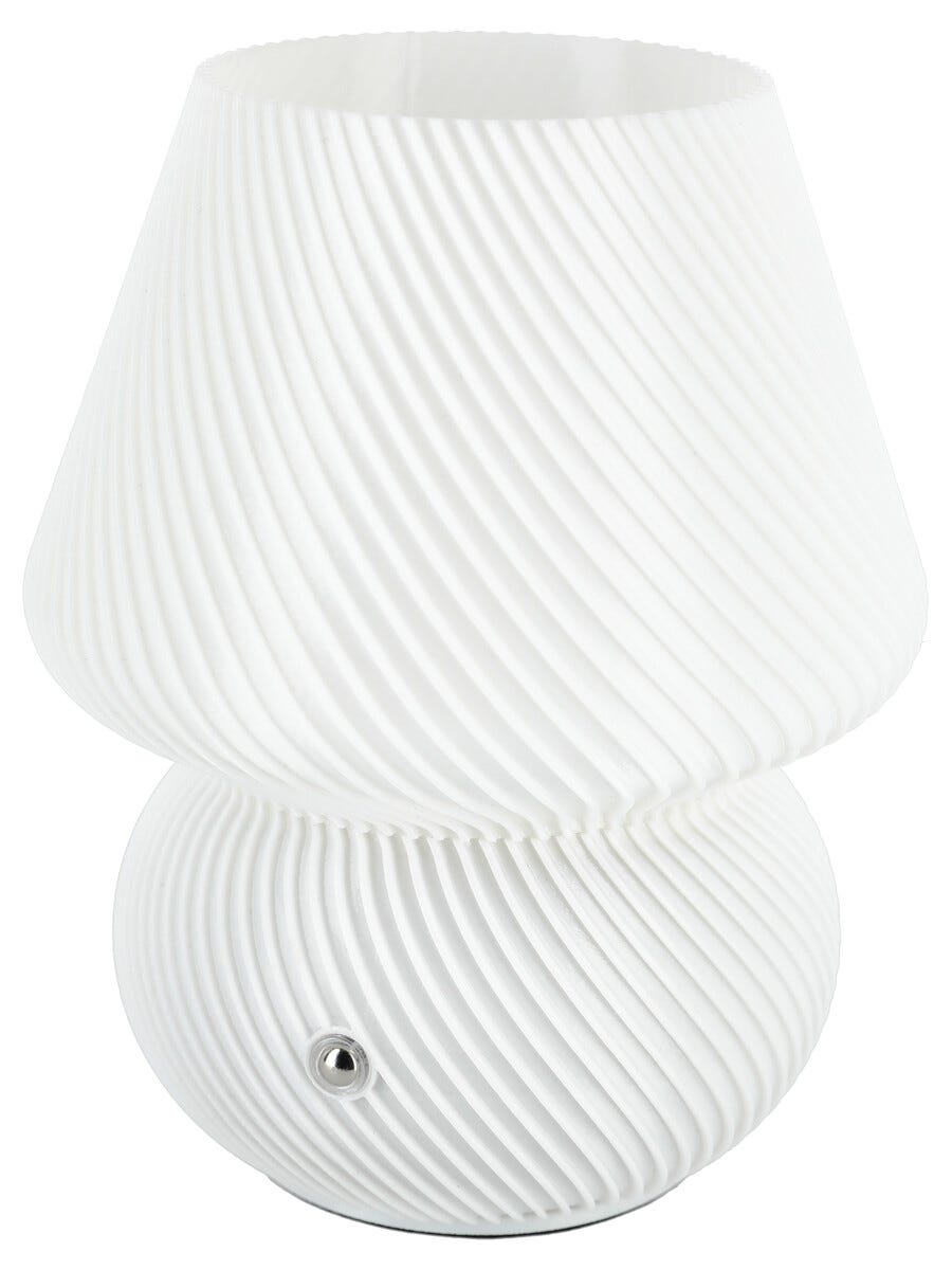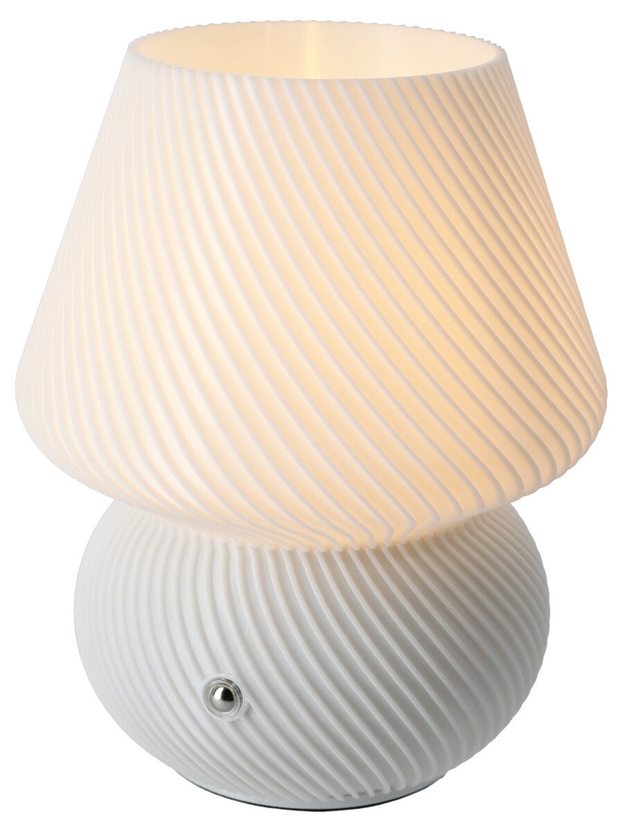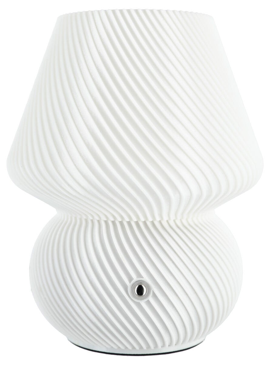 • Kompakti valkoinen akkukäyttöinen valaisin, jossa 3D-printtikuvio ja heikko koristevalo.
