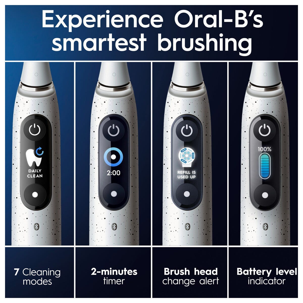• Oral-B iO 10 – valitse kielen puhdistus, ikenien hoito, erittäin hellävarainen puhdistus, tehokas puhdistus, valkaiseva puhdistus, hellävarainen puhdistus tai päivittäinen puhdistus.