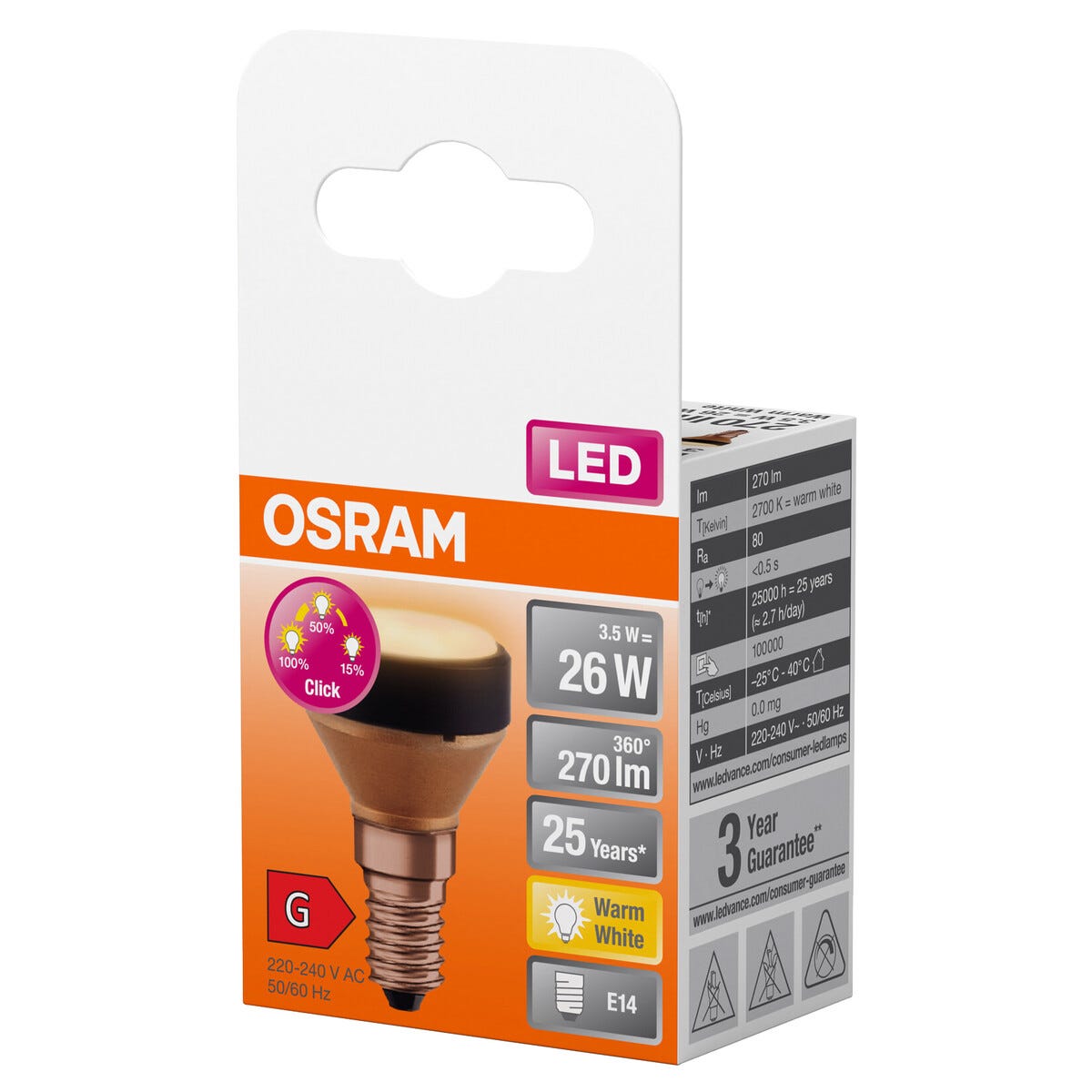 • Osram E14 LED-lampa med 3-stegs dimfunktion via strömbrytare.