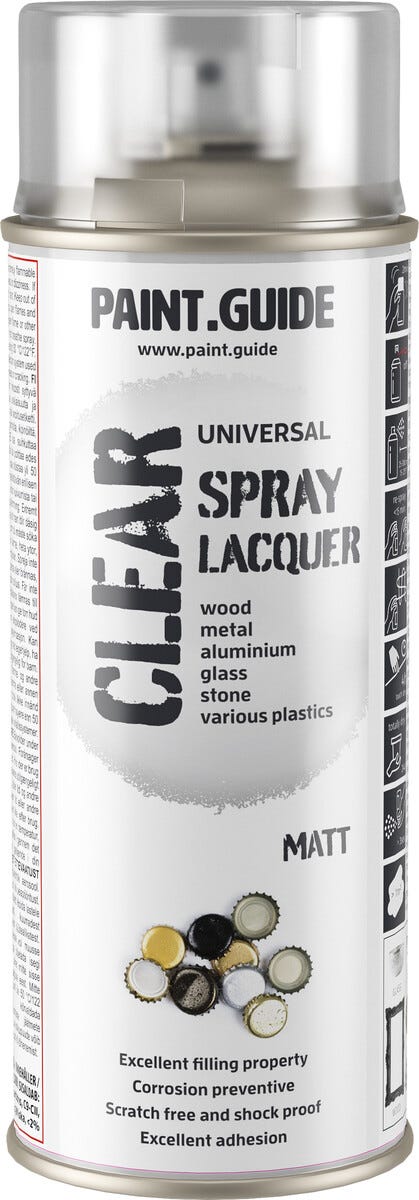 • Paintguide kirkaslakka -spray – säänkestävä, läpinäkyvä akryylilakka.
