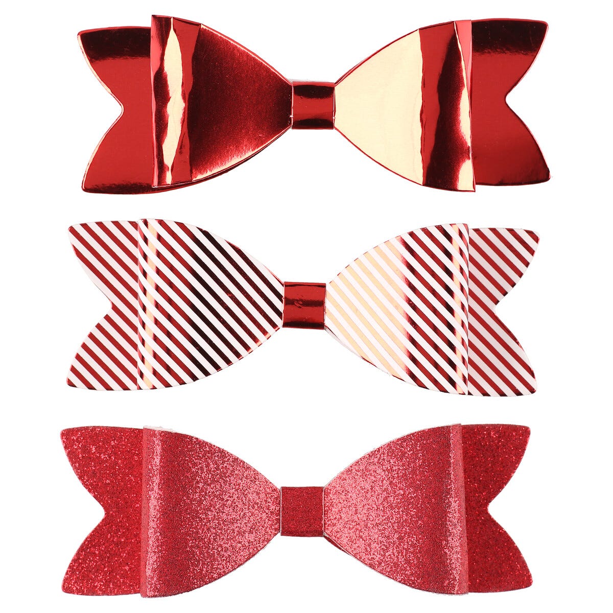 • Presentdekoration fluga i 3 varianter – rött glitter, randig och metallic.