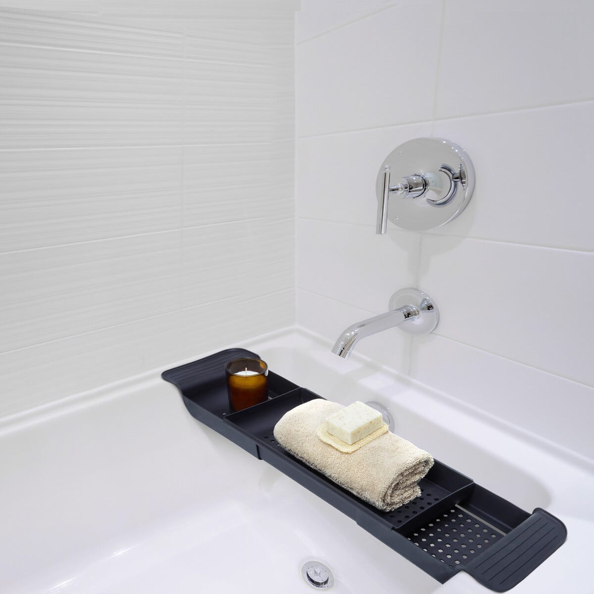 • Musta tarjotin kylpyammeeseen – kaikki tarvittava käden ulottuvilla.