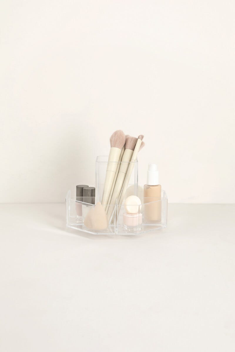 • Säilytä meikit näppärästi pienessäkin tilassa käyttämällä pyörivää meikkitelinettä.