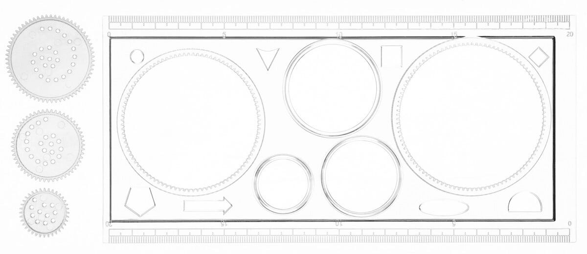 Piirustusmalli on kätevä apuväline, kun haluat piirtää erilaisia geometrisiä kuvioita. Kolme erilaista hammastettua mallia, joiden avulla voit luoda erilaisia kuvioita.