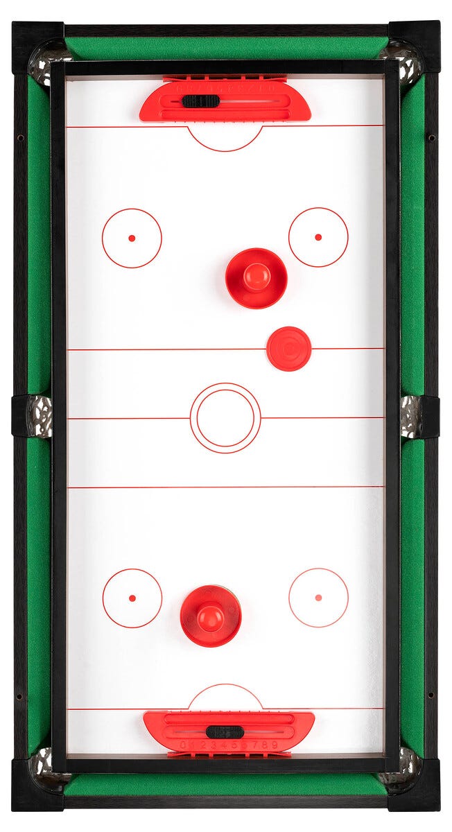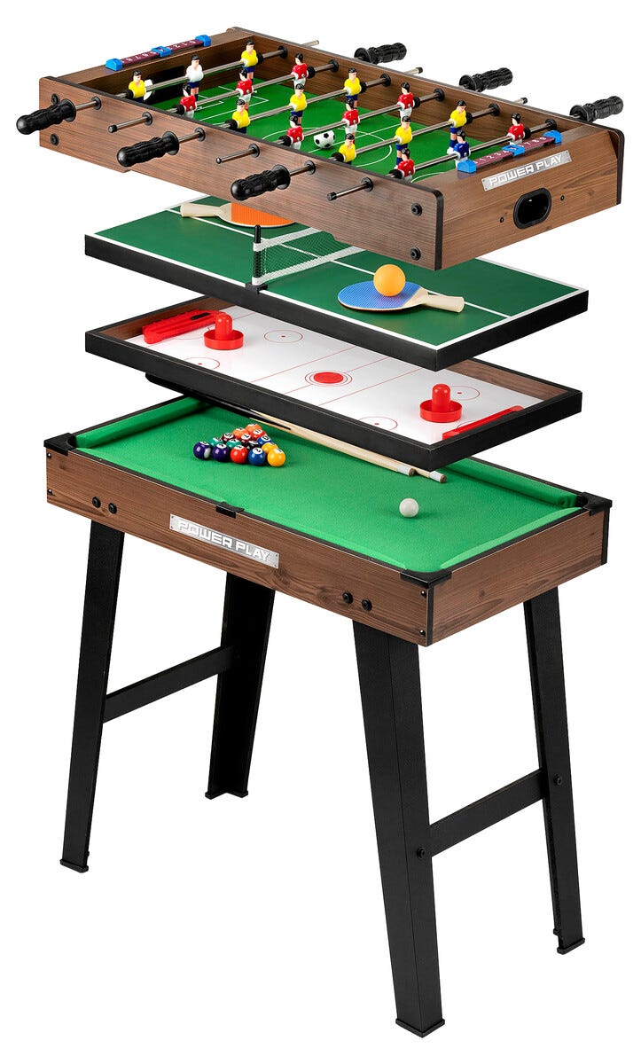 • Neljä pöytäpeliä samalla pöydällä – jalkapallo, biljardi, ilmakiekko ja pöytätennis.