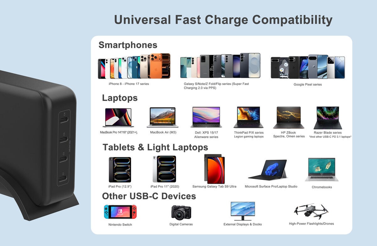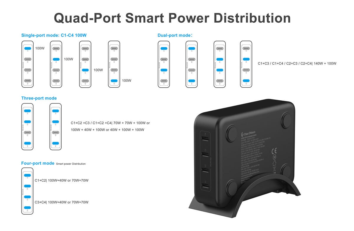 • Bordsladdare med stöd för Power Delivery 3.1 via samtliga fyra USB-C portar.