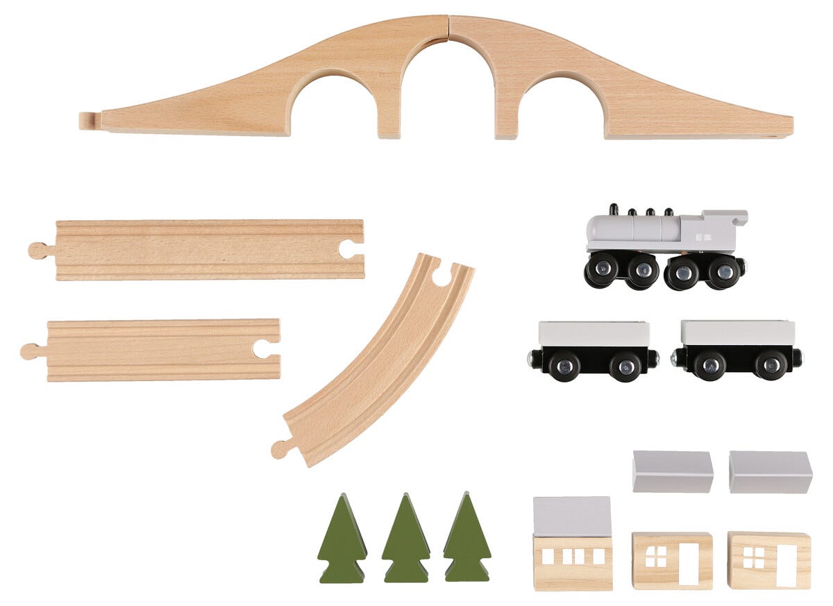 • FSC®-merkitty leikkijunarata, johon kuuluu veturi, junavaunuja, kiskoja ja tarvikkeita.