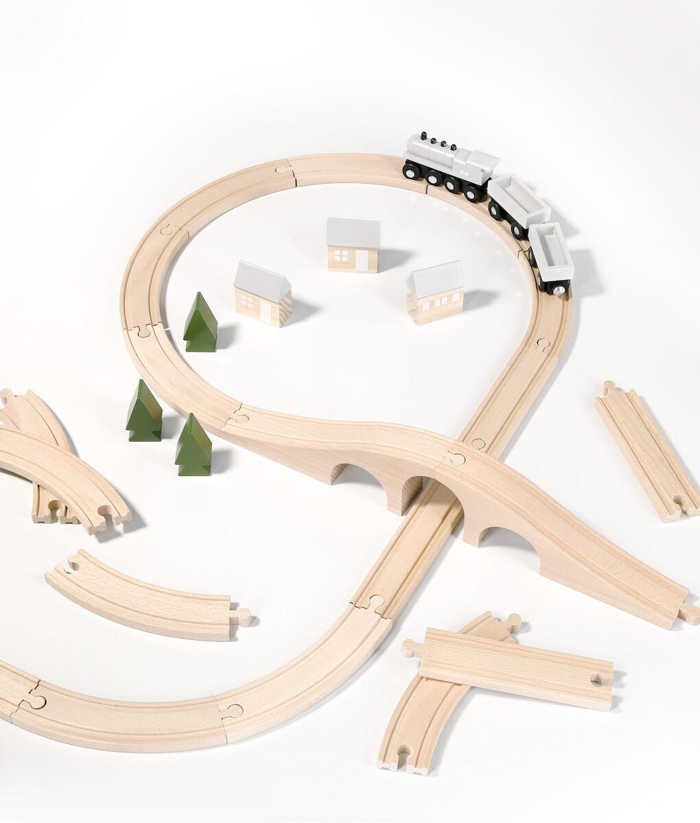• FSC®-merkitty leikkijunarata, johon kuuluu veturi, junavaunuja, kiskoja ja tarvikkeita.