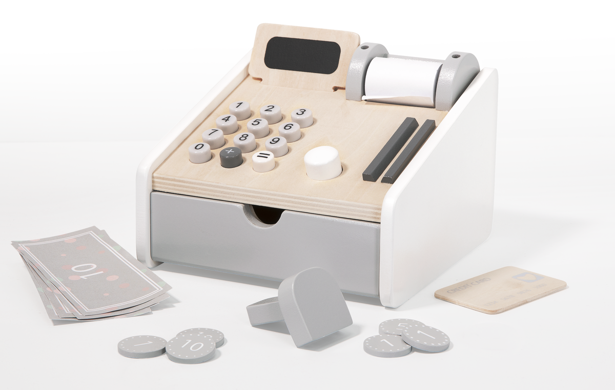 • Puusta tehty kassakone, jossa näyttö, kortinlukija, hintaskanneri, kuittirulla ja kassalaatikko.