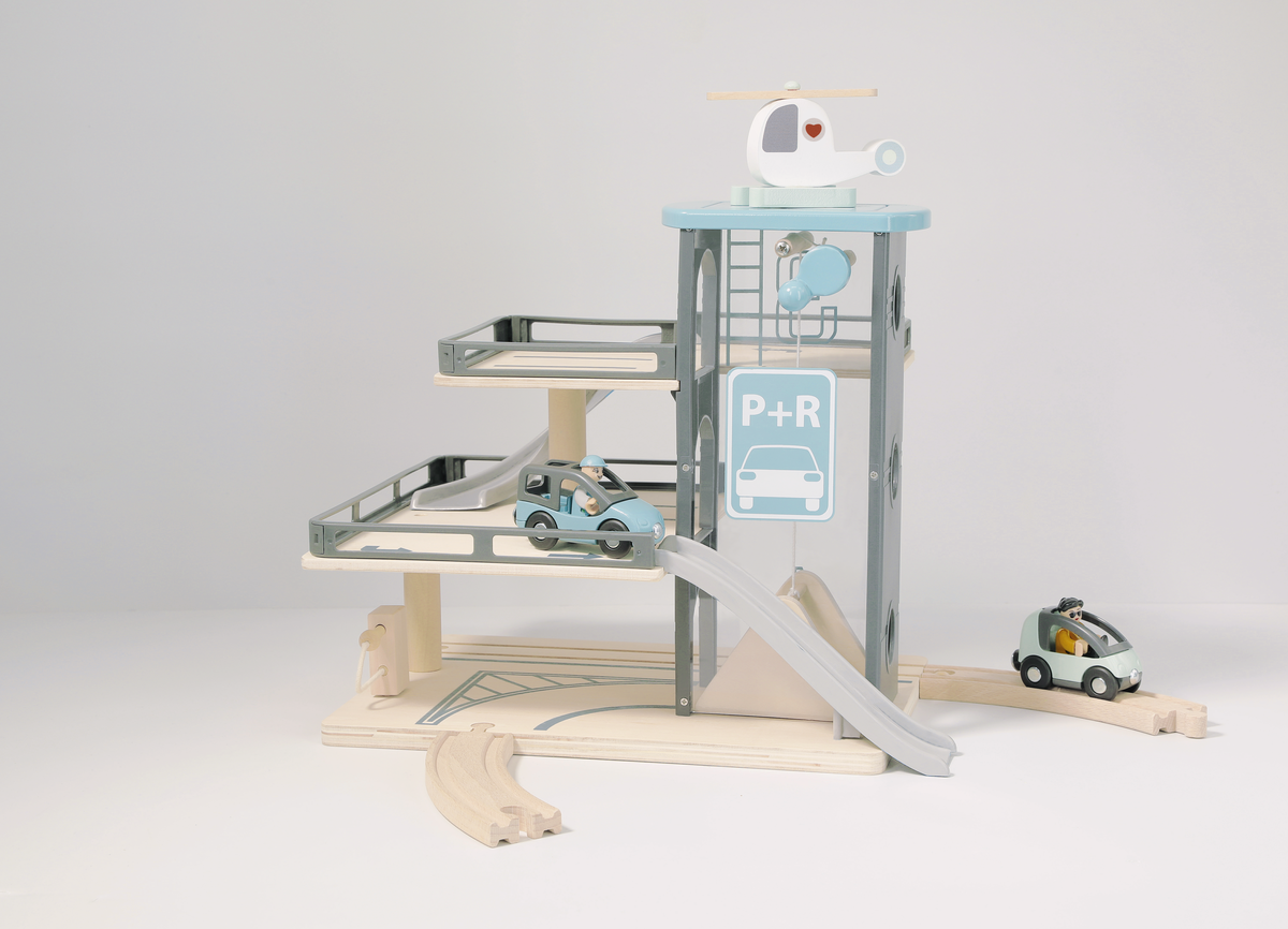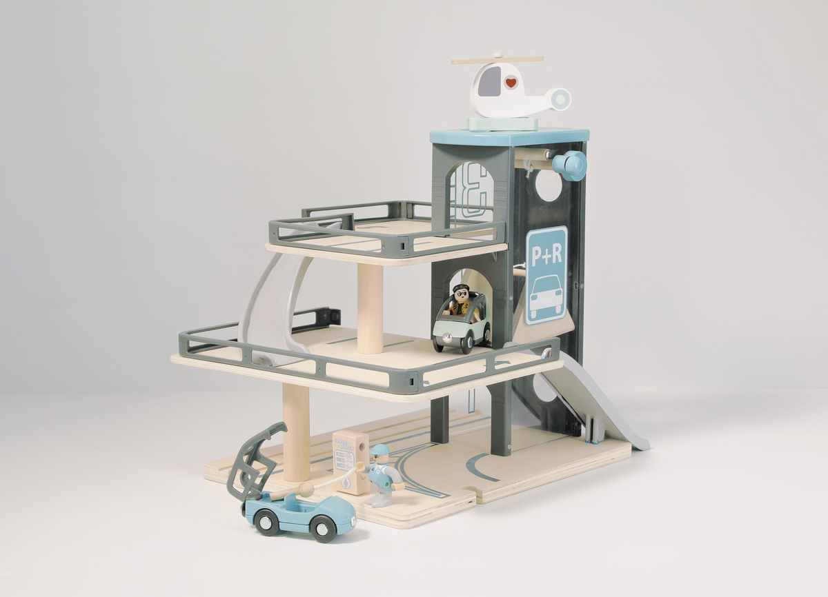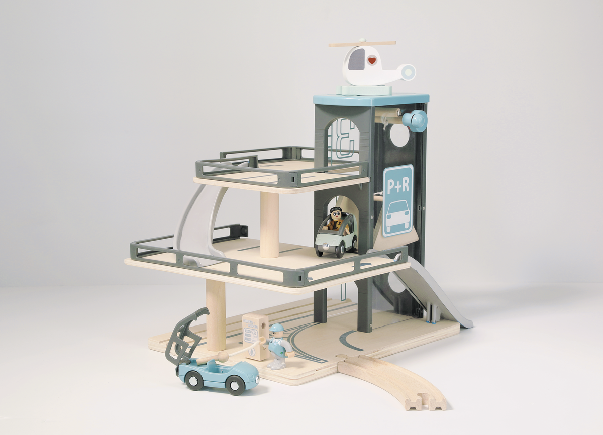 • Leksaksgarage i 3 plan med hiss, bensinpump och helikopterplatta.