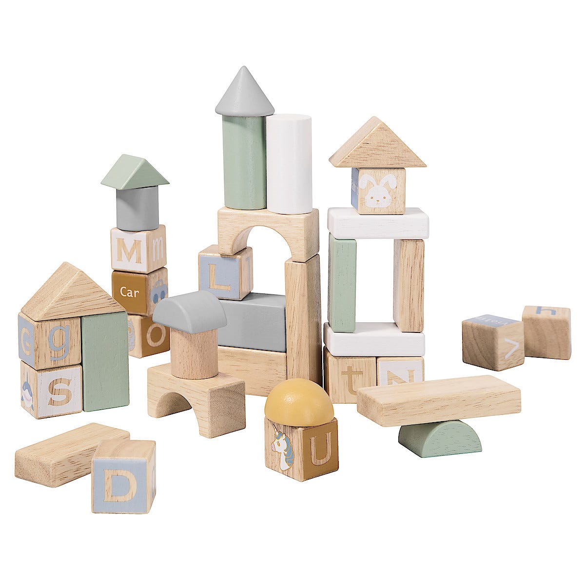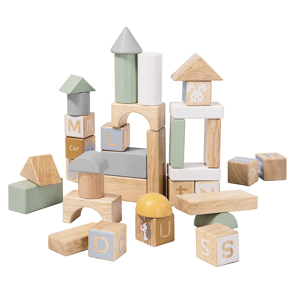 • Puupalikat, joissa on kirjaimia, englanninkielisiä sanoja sekä eläinten ja esineiden kuvia.