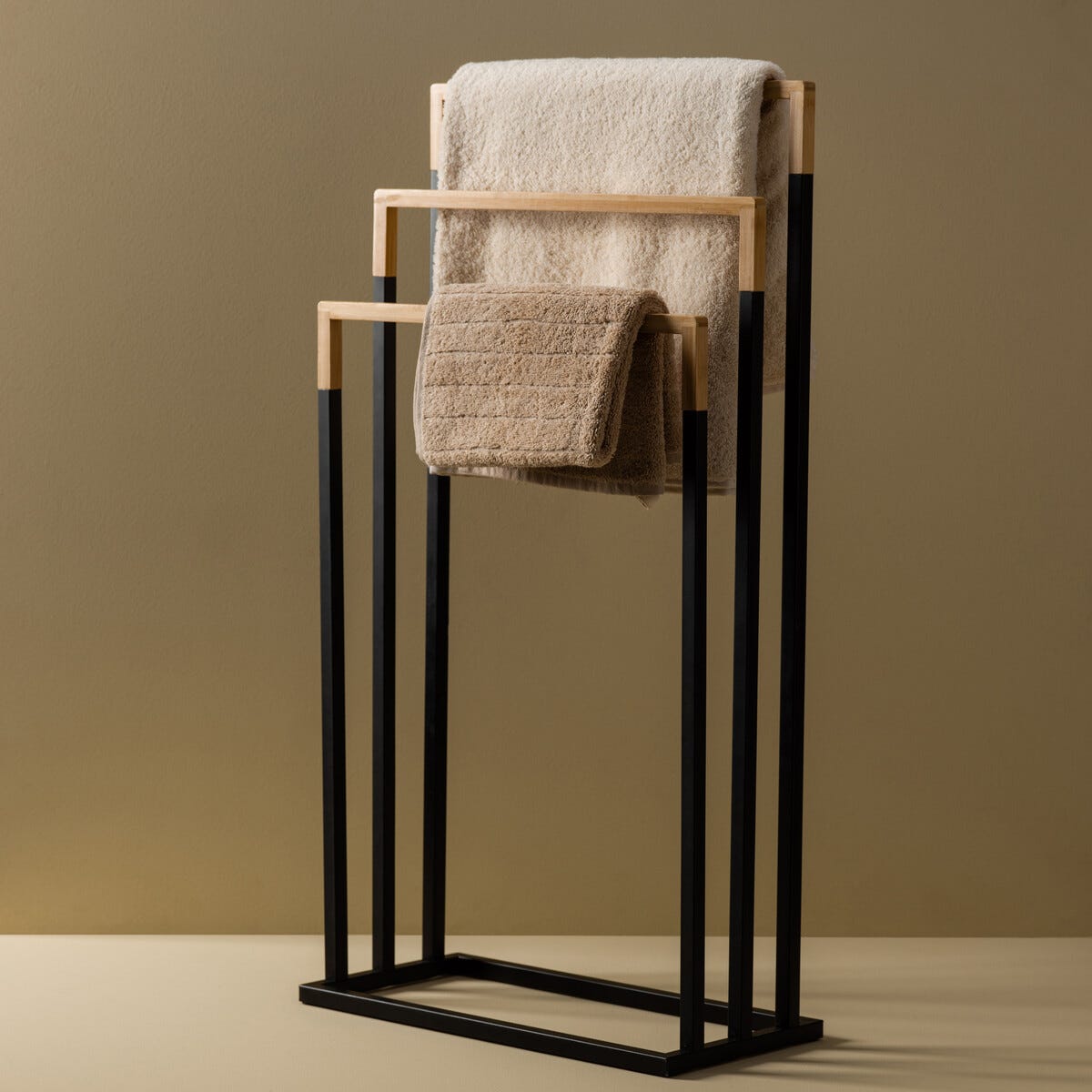 • Handuksstång i 3 nivåer – hållare i svartlackerat stål och bambu.