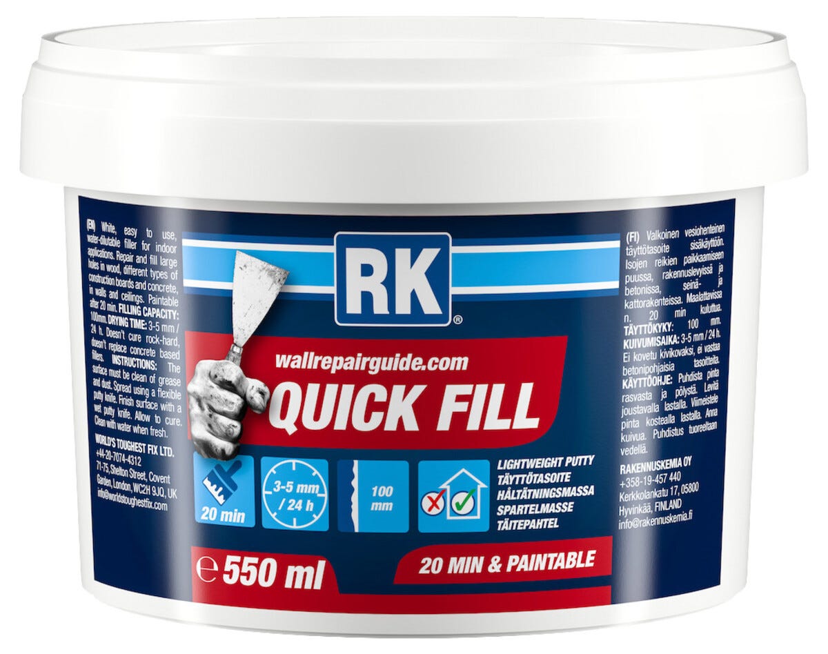 • RK Quick Fill -pikatasoite – kuivumisen jälkeen voit porata, ruuvata ja naulata.