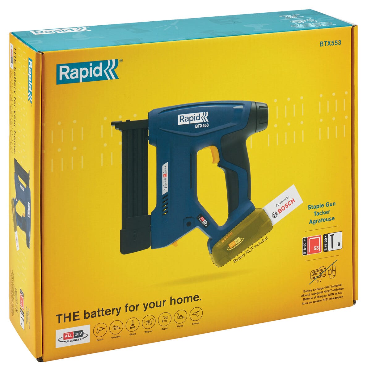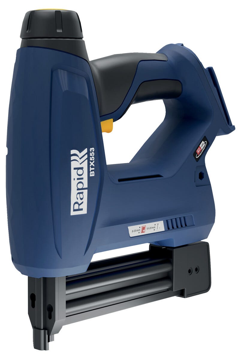 • Akkukäyttöinen Rapid BTX553 -niittipistooli – jopa 2500 laukaisua yhdellä latauksella.