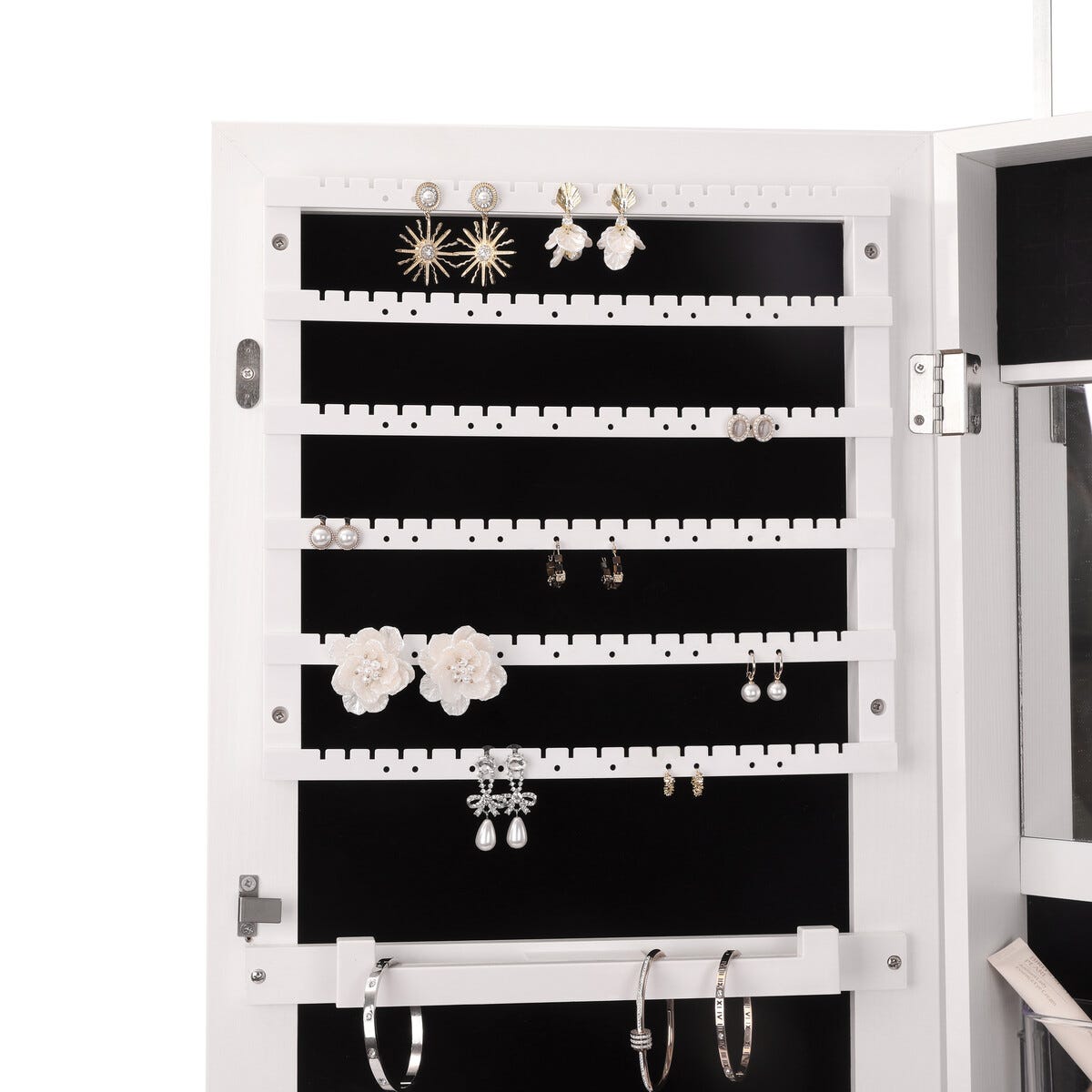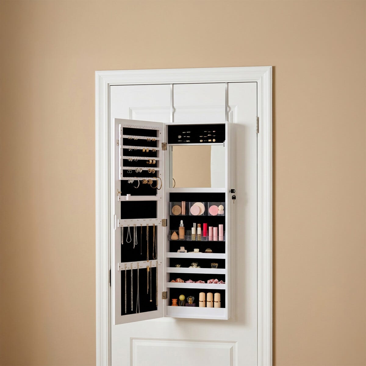 Ripustettava kaappi koruille ja meikeille peilillä, valkoinen