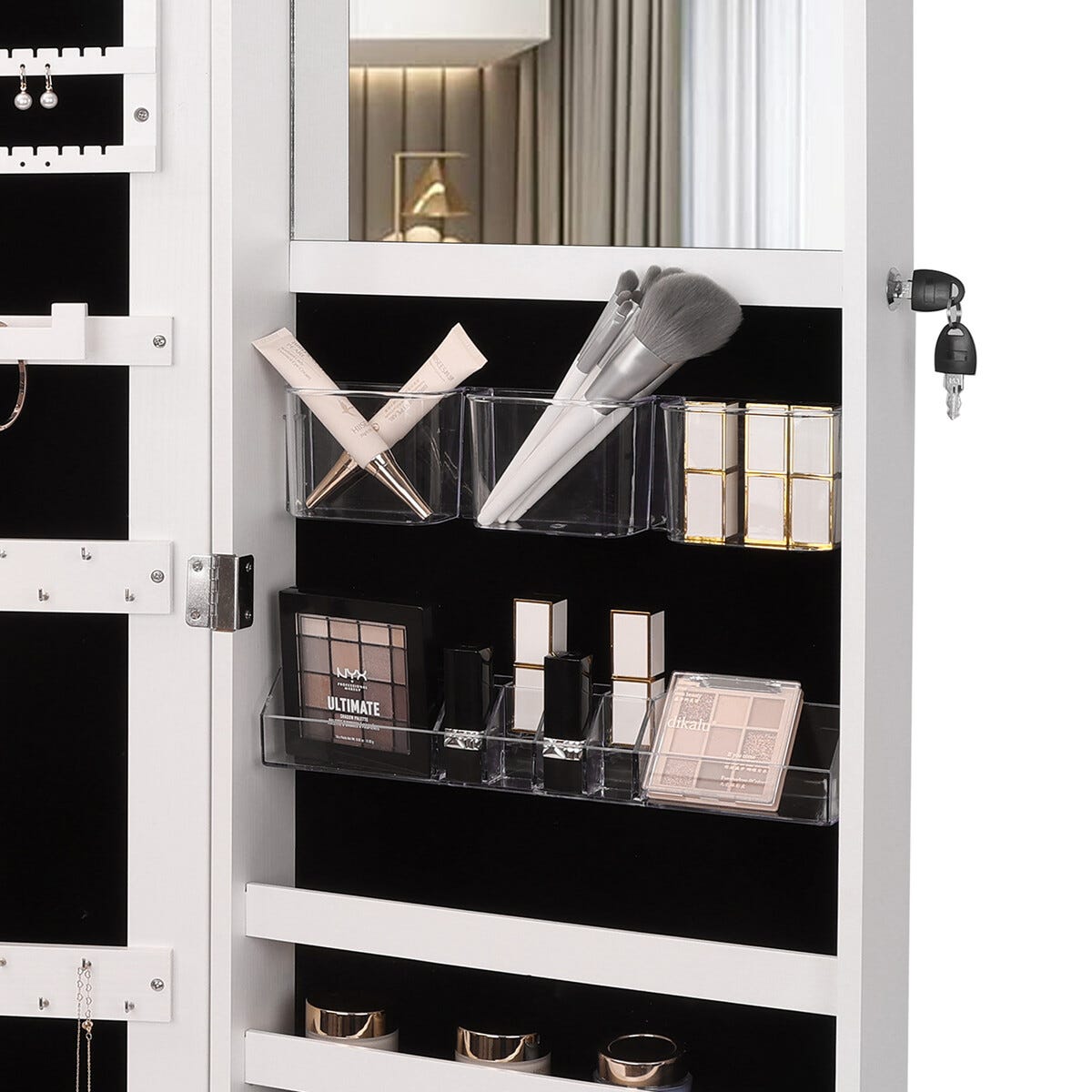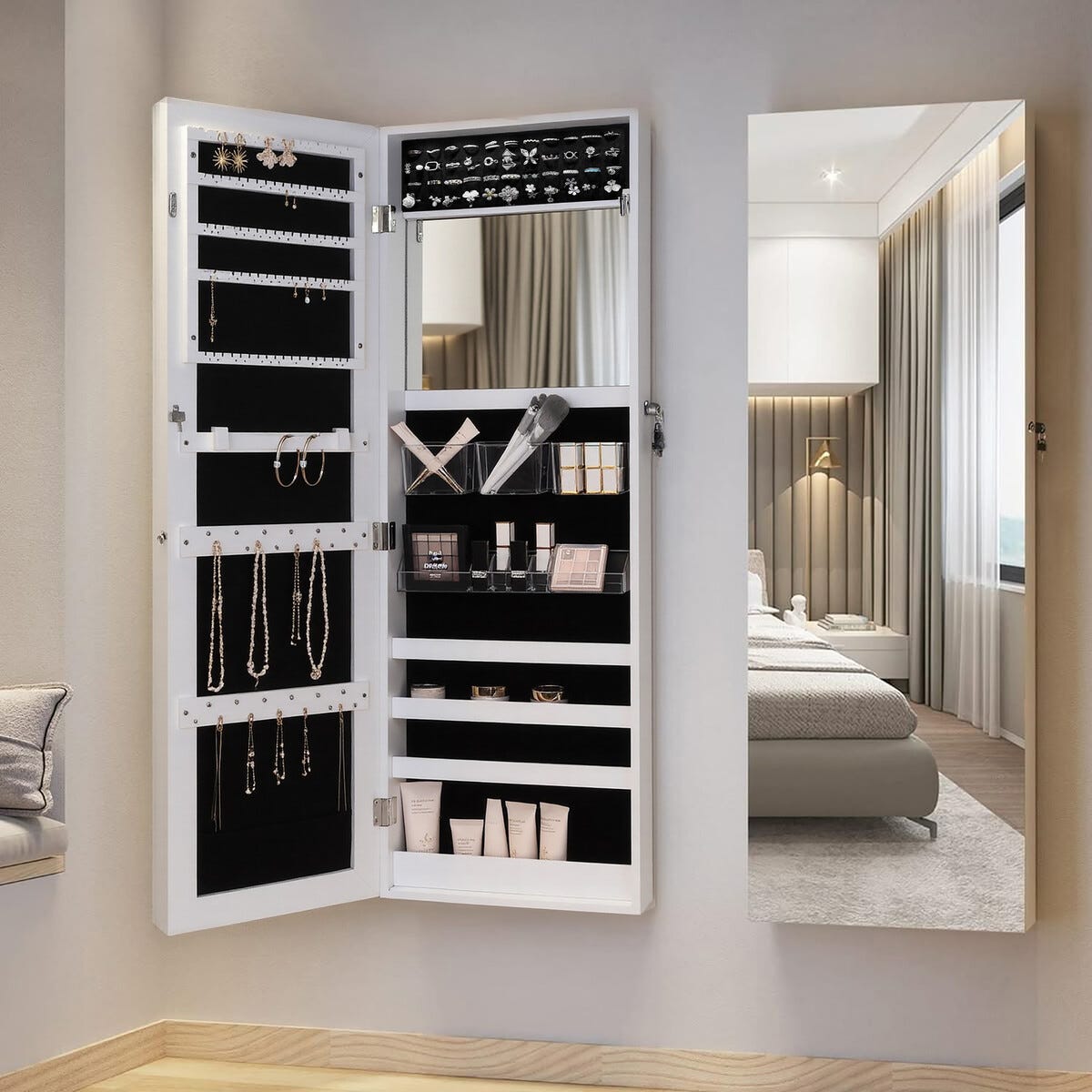 • Meikkikaappi ja korukaappi – peili ja säilytystila samassa.