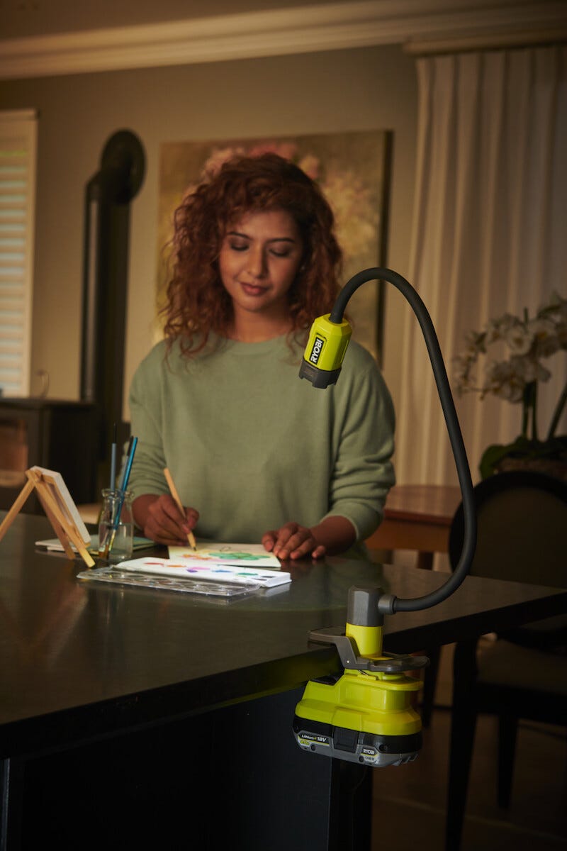 • Ryobi RLCF18-0 – johdoton työvalo, jossa 40 cm pitkä, taipuisa varsi.
