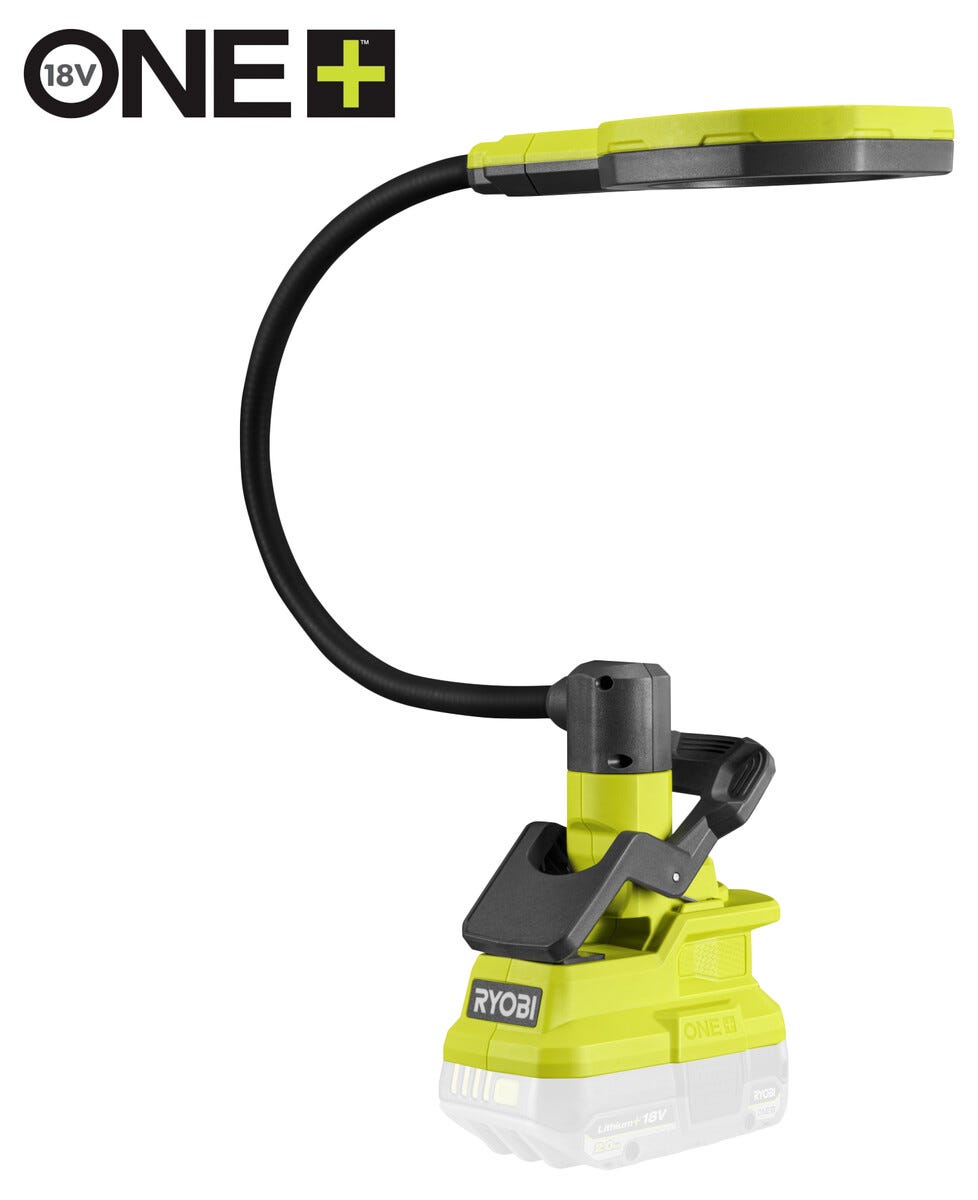 • Ryobi RML18-0 – johdoton työvalo, jossa 40 cm pitkä, taipuisa varsi.