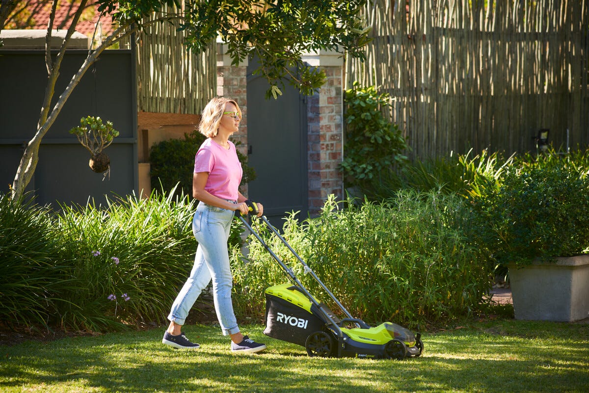 • Ryobin akkukäyttöinen ruohonleikkuri pienemmille nurmikoille.