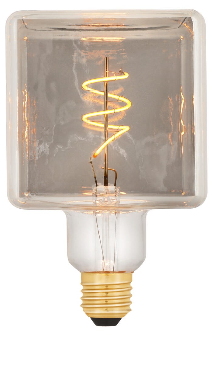 • Koristelamppu, jossa on spiraalin muotoinen filamentti ja savunvärinen lasi.