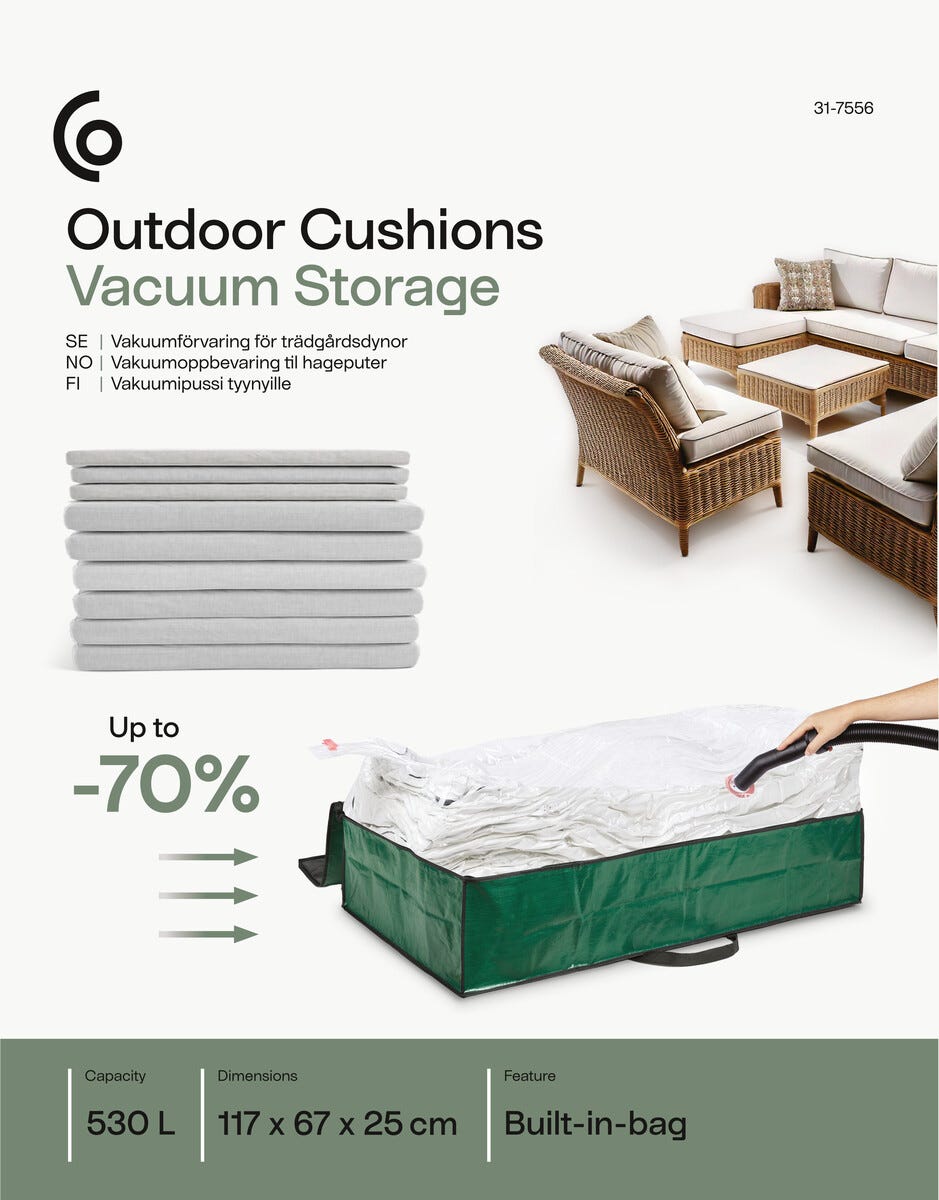 • Helppokäyttöinen tyynyjen säilytysratkaisu – ime ilma pois imurilla.