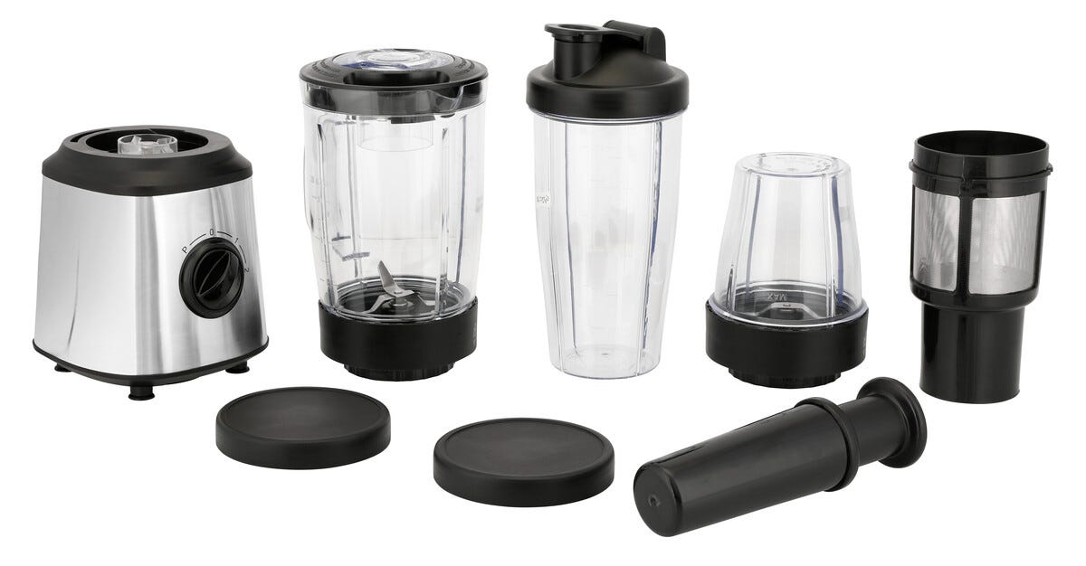 • Multiblender med juicepress, mixer, multihackare och mugg med lock.