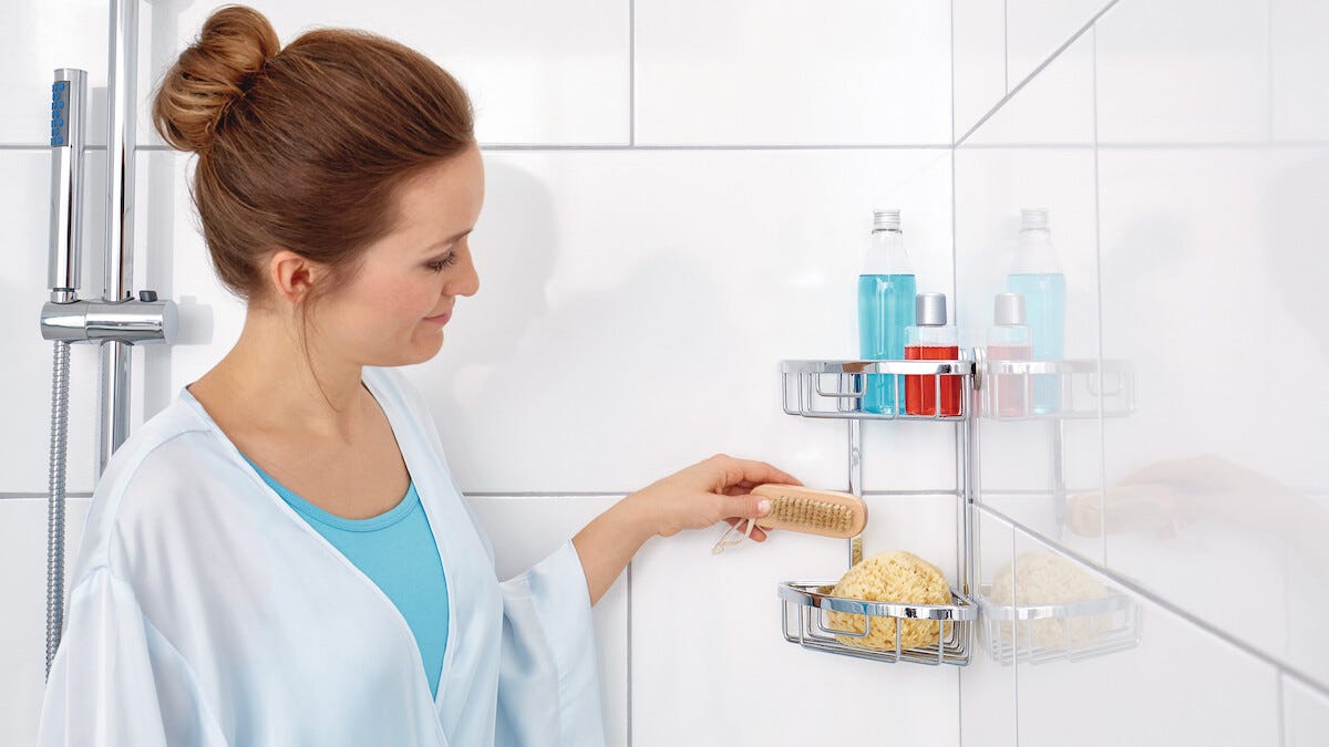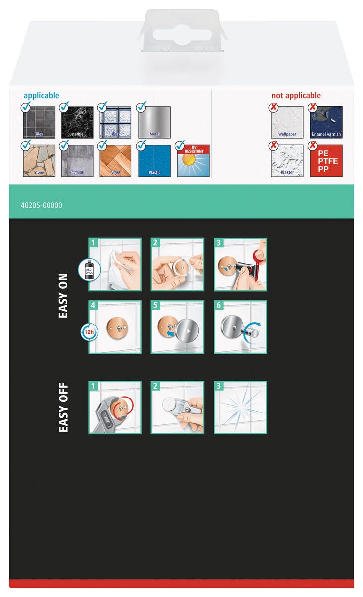 • Itsekiinnittyvä suihkukori – vahva vedenkestävä liima, joka on myös helppo ottaa pois.