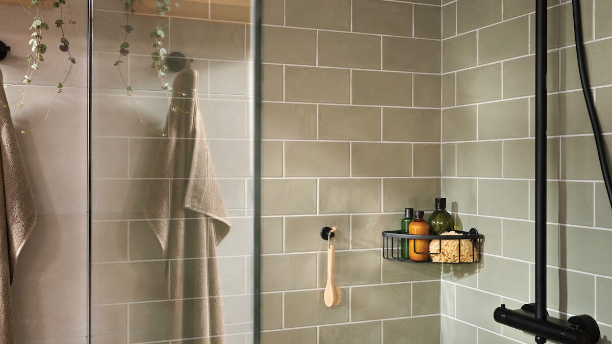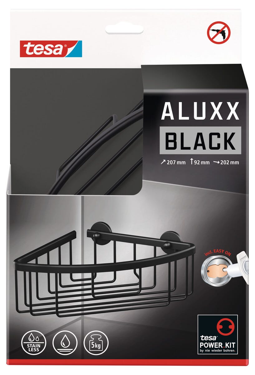 • Tesa Aluxx -kulmakori, matta musta – tyylikäs säilytysratkaisu shampoolle ja suihkusaippualle.