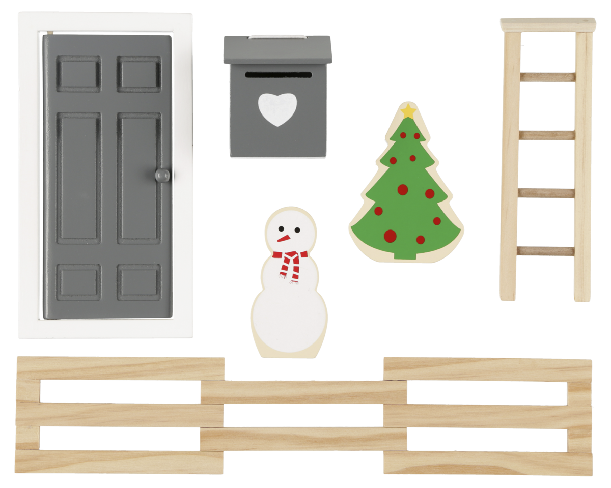 • Set med nissedörr, postlåda, stege, staket, julgran och en snögubbe.