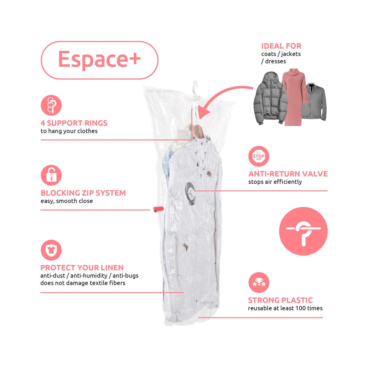 • Vakuumpåsar med hängare – förvara enkelt på garderobsstången.