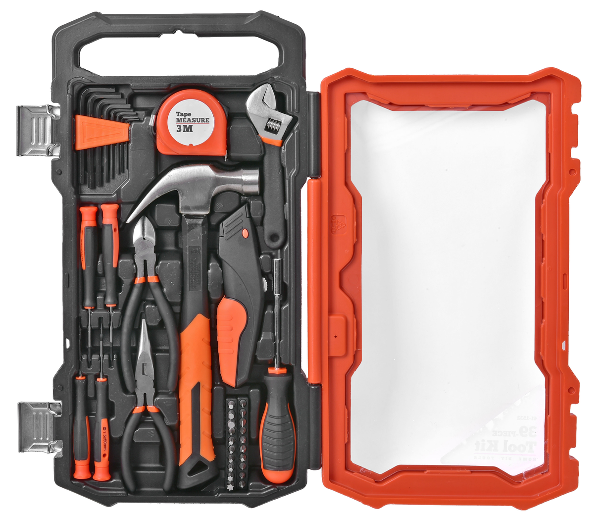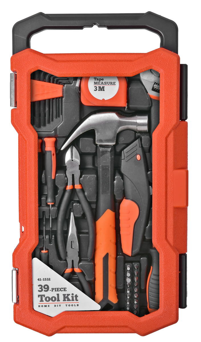 Työkalusarja ruuvauskärkiä, vasara, mattoveitsi ja pihdit, 39 osaa