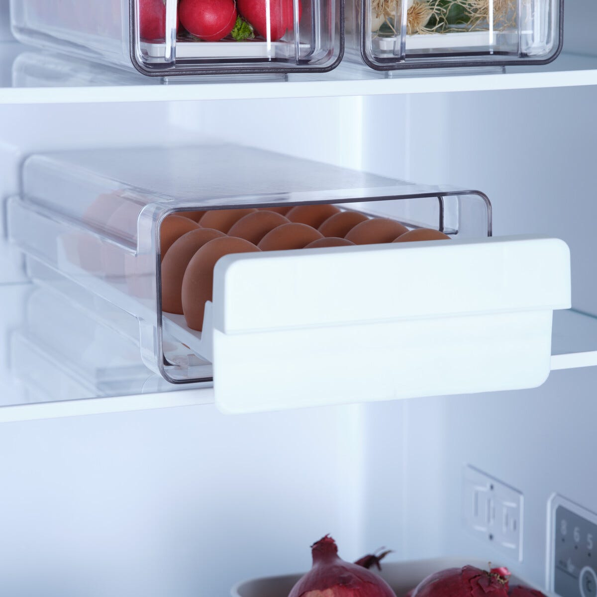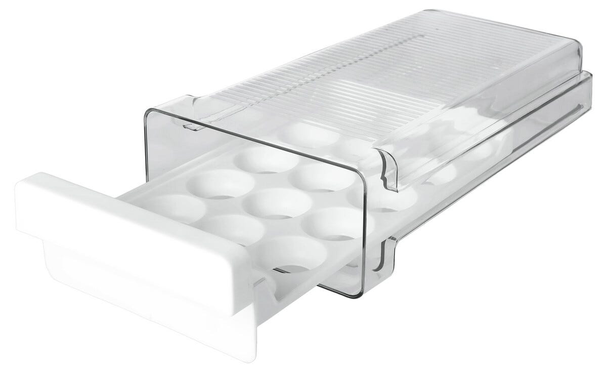 • Hyödynnä jääkaapin korkeus – vedä rasia ulos ja poimi tarvittava määrä munia.