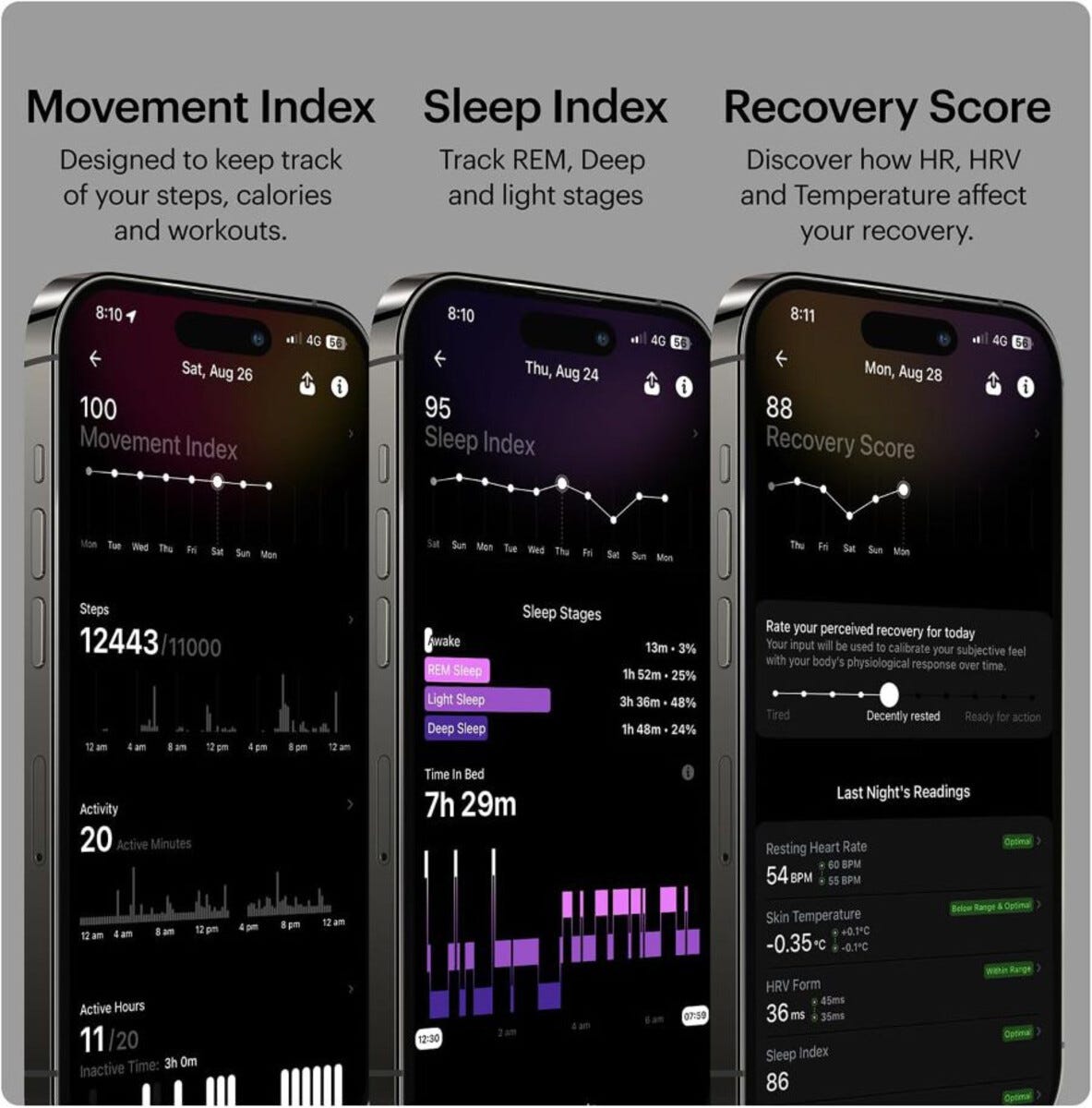• Träningsringen mäter biomarkörer från dina fingrar för exakt data.