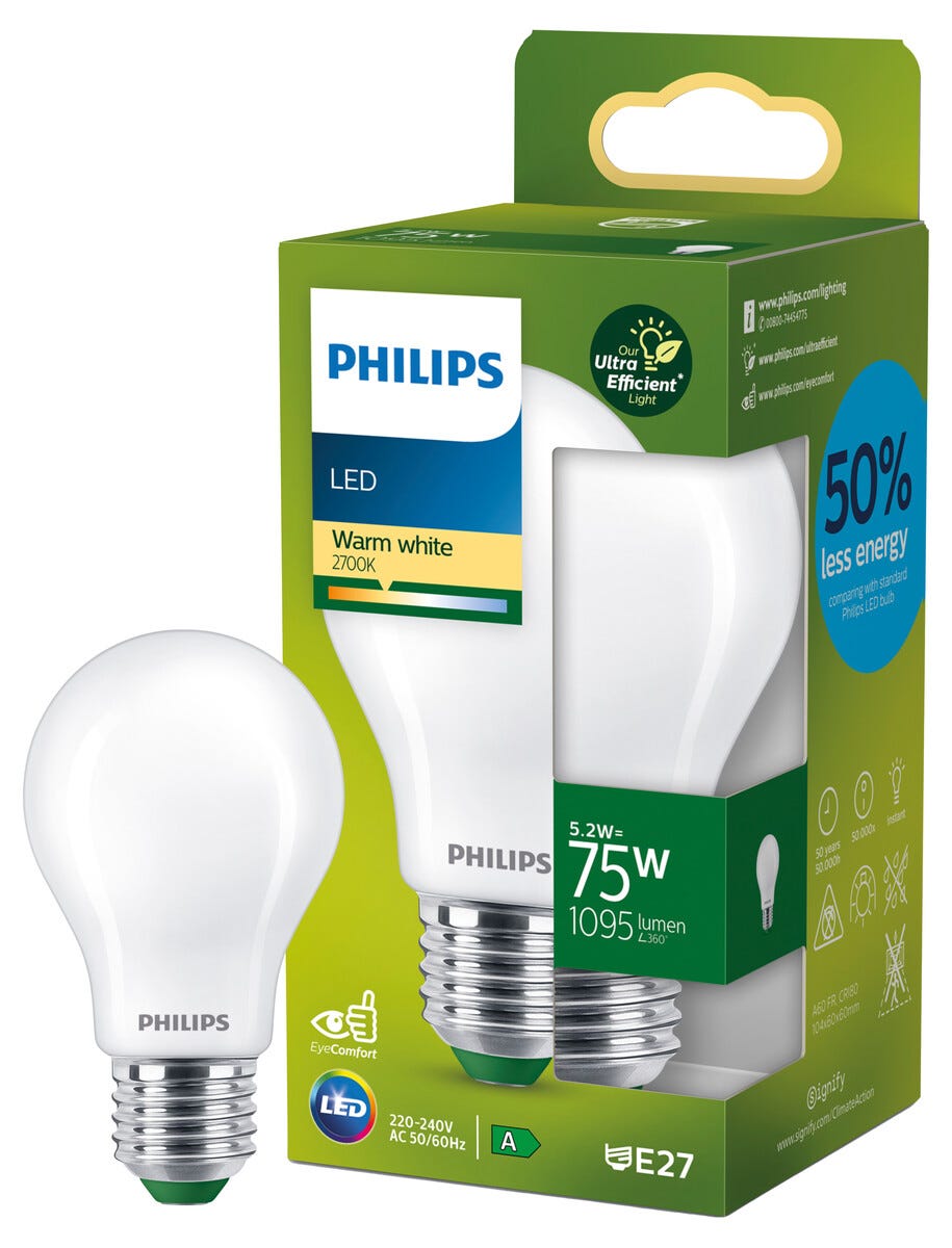 LED Lamppu Philips Ultra Efficient E27 A60, 5,2 W, lämpimän valkoinen