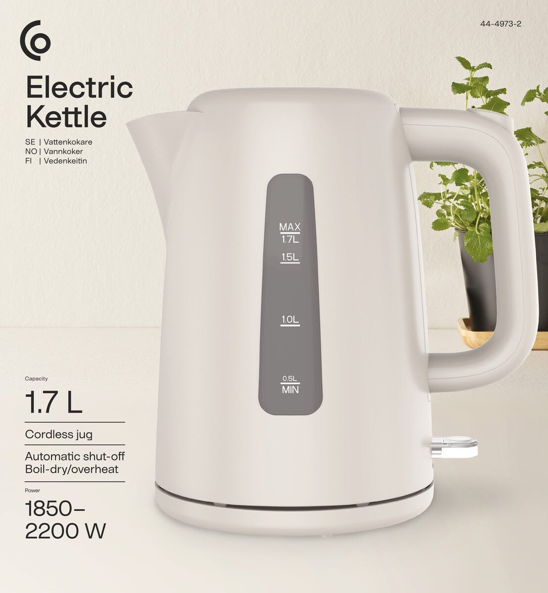 • Vattenkokare i plast – enkel modell med flera säkerhetsfunktioner.