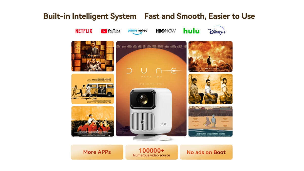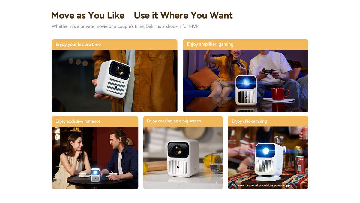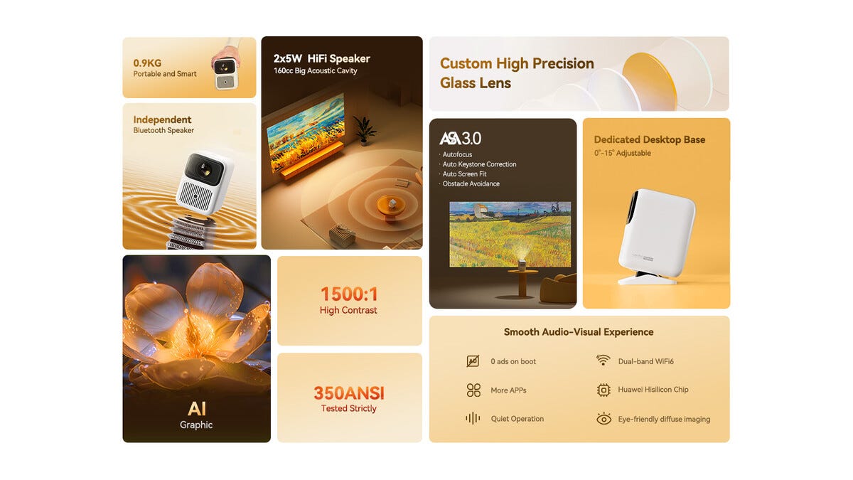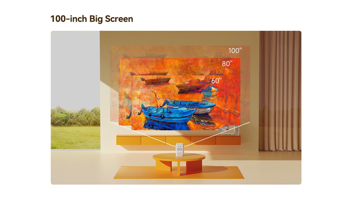 • Wanbo Dali 1 -projektori, jossa automaattinen tarkennus, keystone-korjaus ja kuvasovitus.