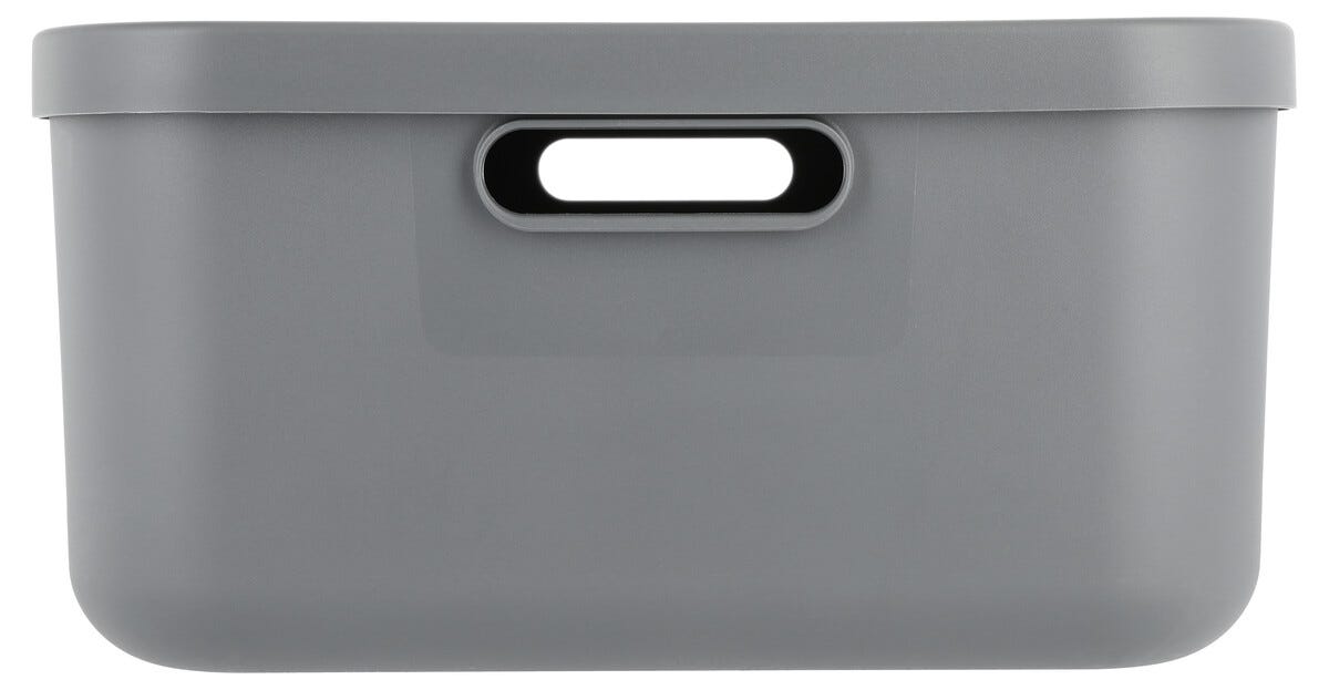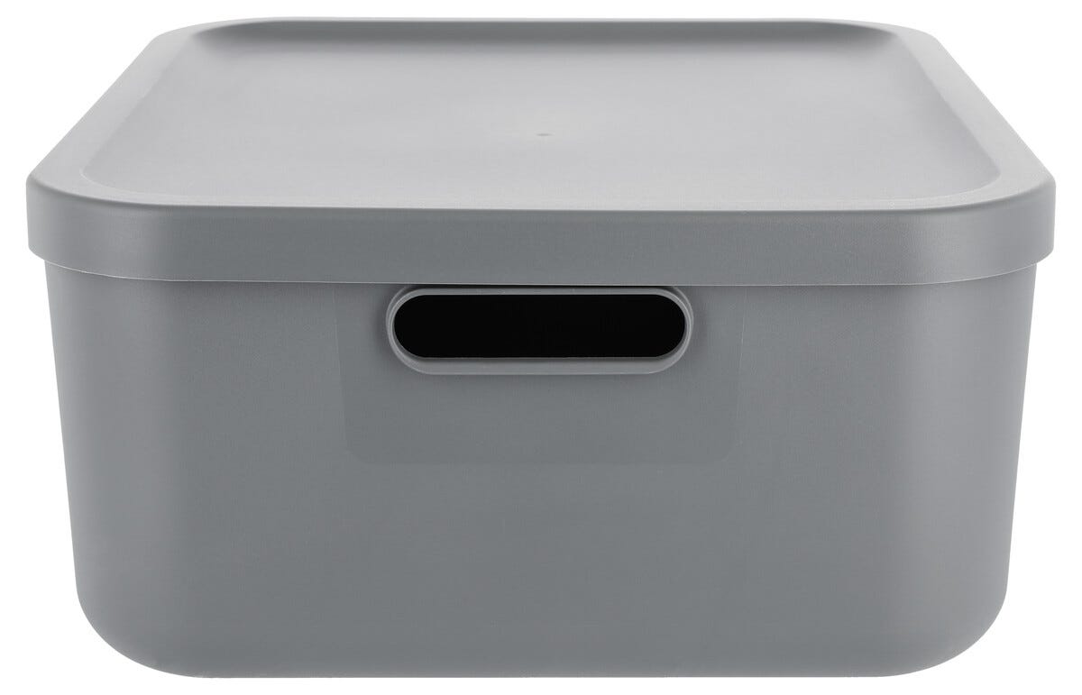 • Harmaa Tidy-säilytyslaatikko, jossa kansi – kestävää uusiomuovia.