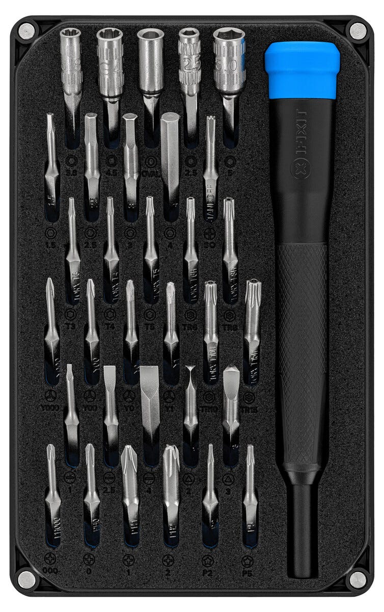 • iFixit Moray -tarkkuusruuvitaltta – pieni ja kattava sarja, jossa on 32 tarkkuuspalaa.