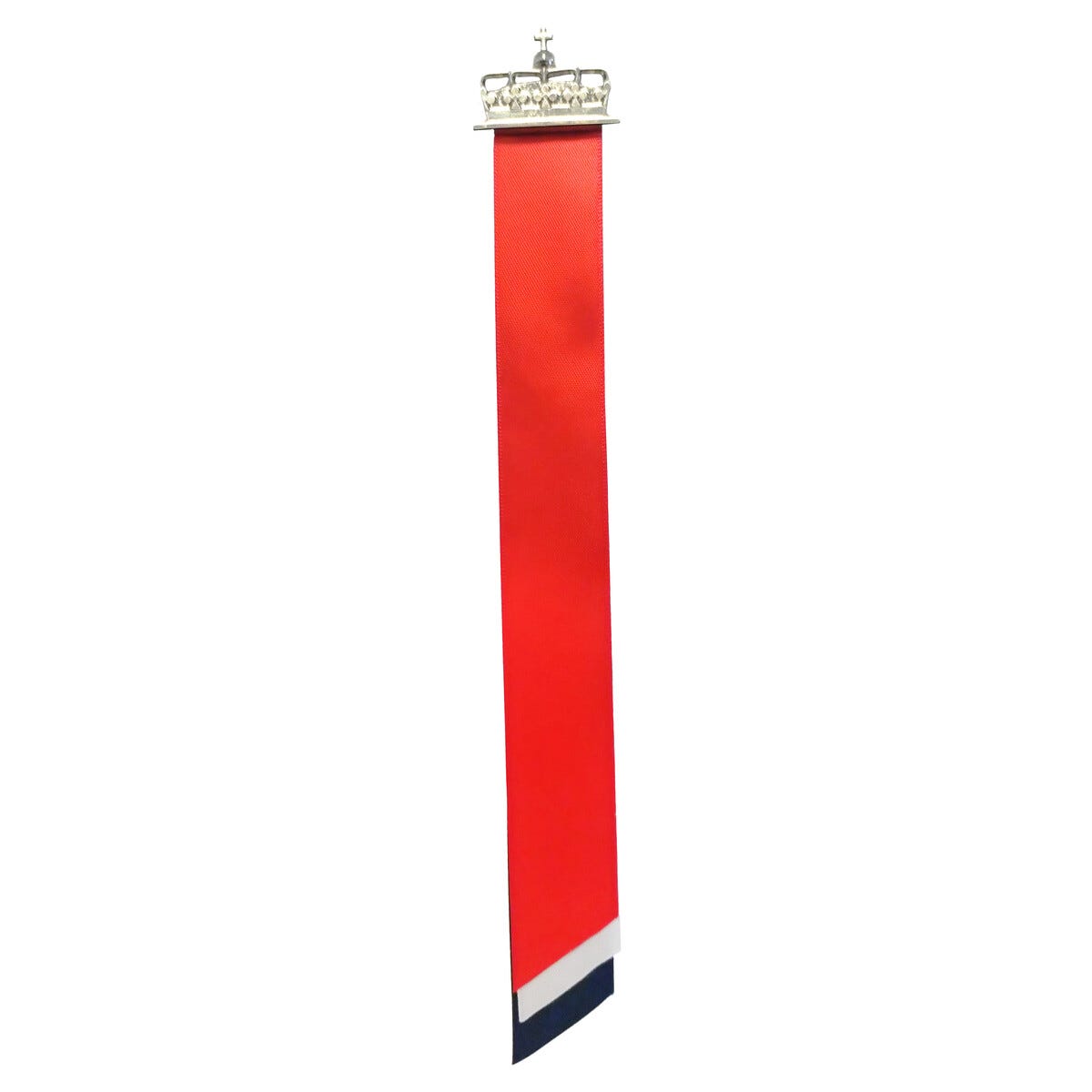 • Bånd i rødt, hvitt og blått og et metallmerke formet som en krone.
