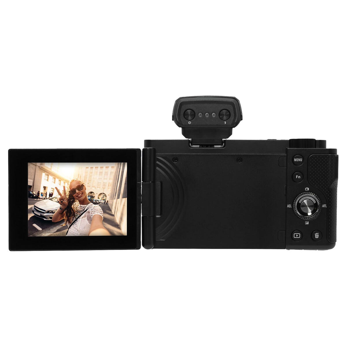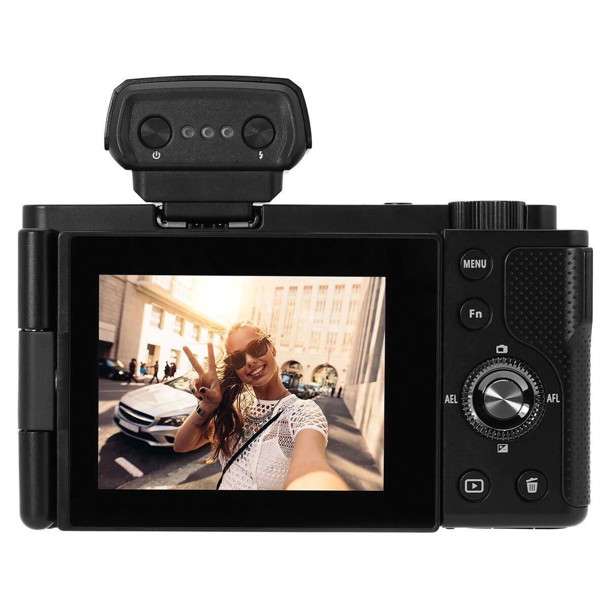 • Wifi-støtte via OD CAM-appen. Avtakbar blits følger med, minnekort (microSD) selges separat.