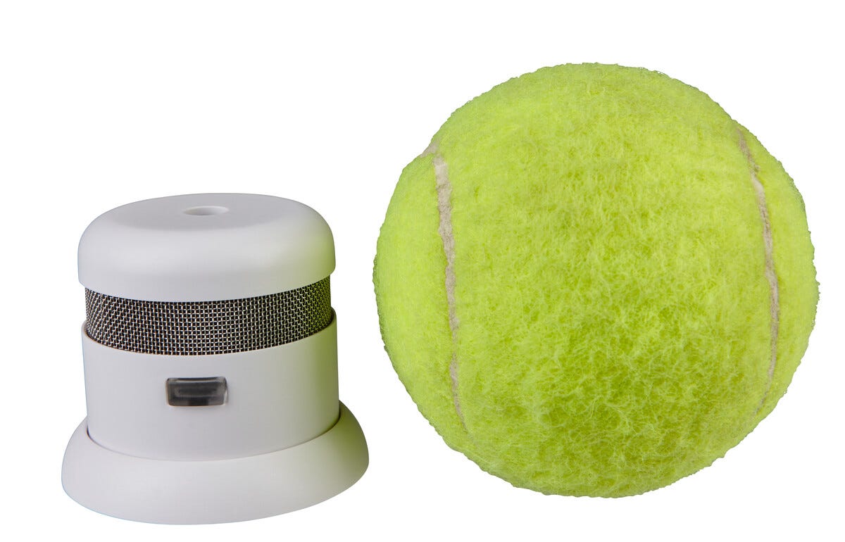 • Mindre enn en tennisball, men med like stor kapasitet som en større brannvarsler.